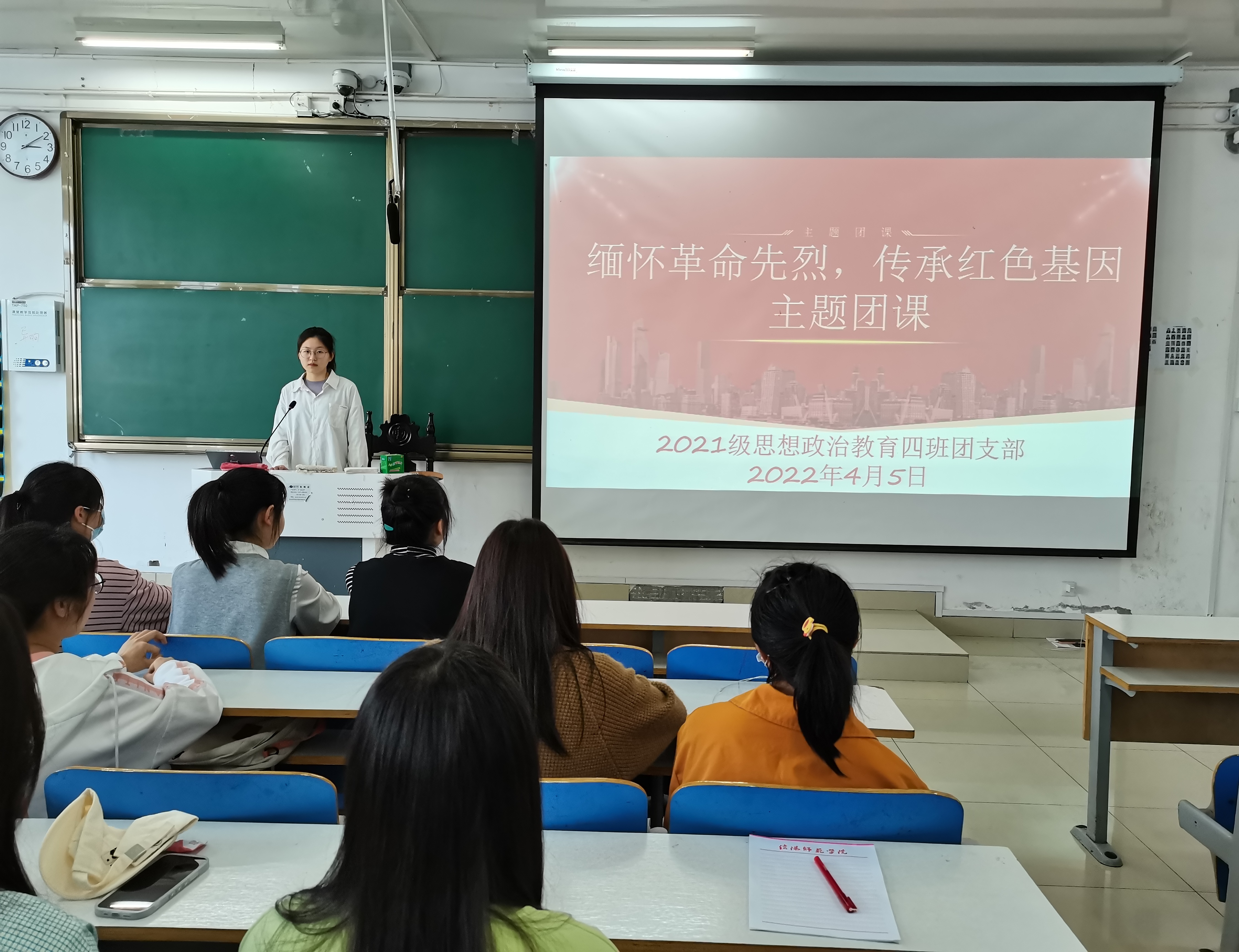 为表达对革命先烈们的崇敬和尊重,传承中华民族精神,4月5日下午,beat365在线唯一官网2021级思想政治教育四班在社科楼516教室开展“缅怀革命先烈,传承红色基因”主题团课。2021级思想政治教育四班全体团员参加本次团课。团课由团支书刘珂含主持。