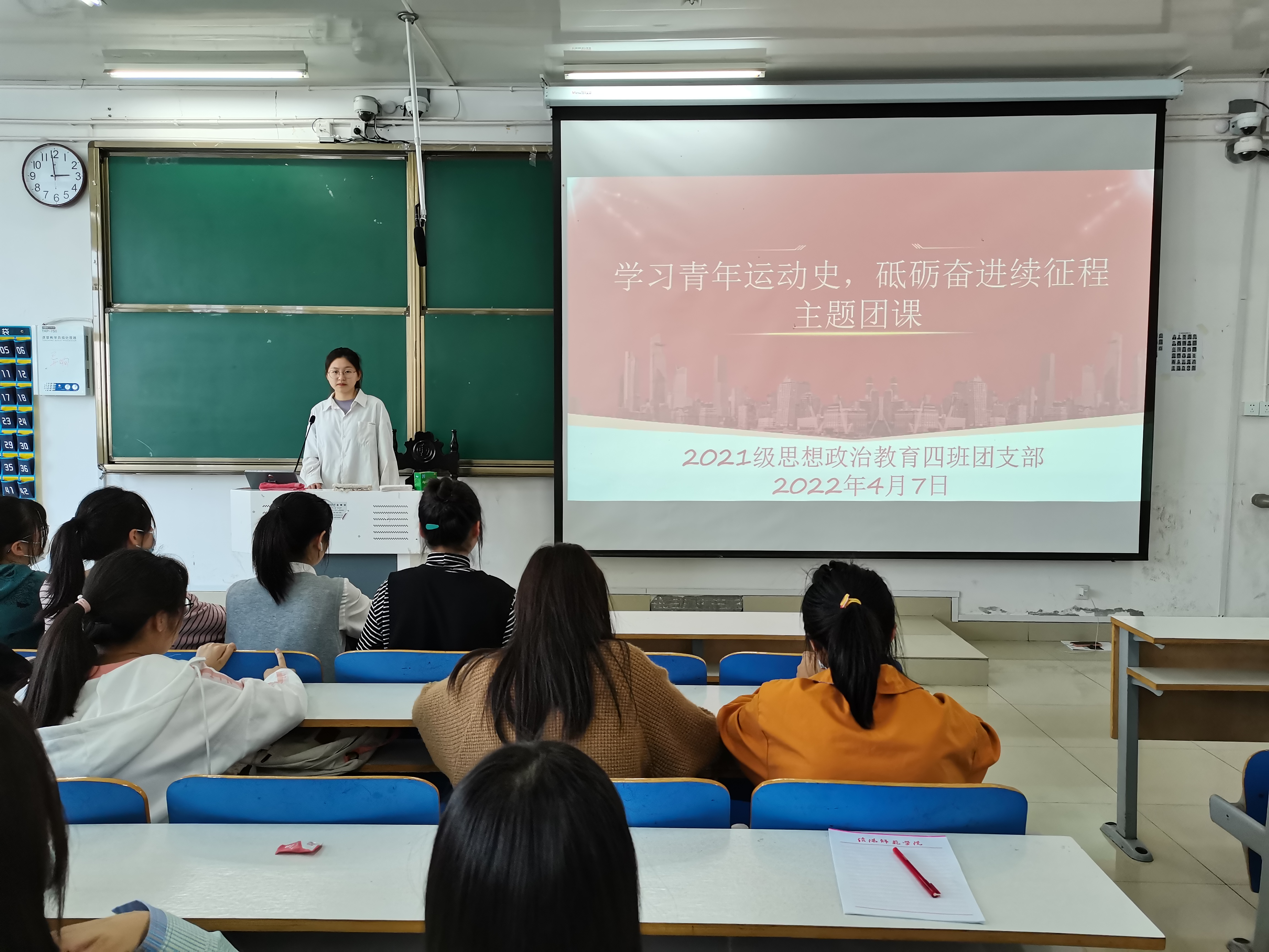 4月7日下午,beat365在线唯一官网2021级思想政治教育四班在社科楼516教室开展“学习青年运动史,砥砺奋进绪征程”主题团课。2021级思想政治教育四班全体团员共同参与本次团课,团课由团支书刘珂含主持。