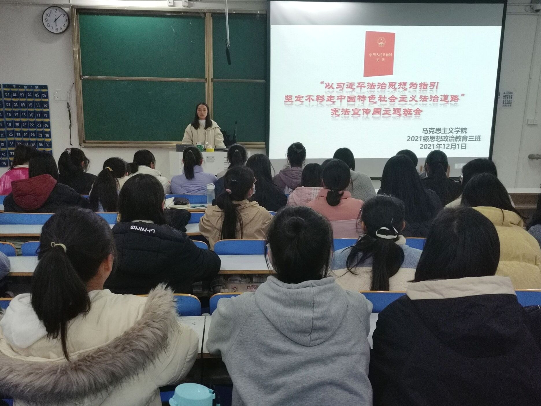 12月1日下午,beat365在线唯一官网2021级思想政治教育三班宪法宣传周主题班会在社科楼516教室召开。2021级思想政治教育三班全体同学参加此次班会,班会由副班长王岚霄主持。