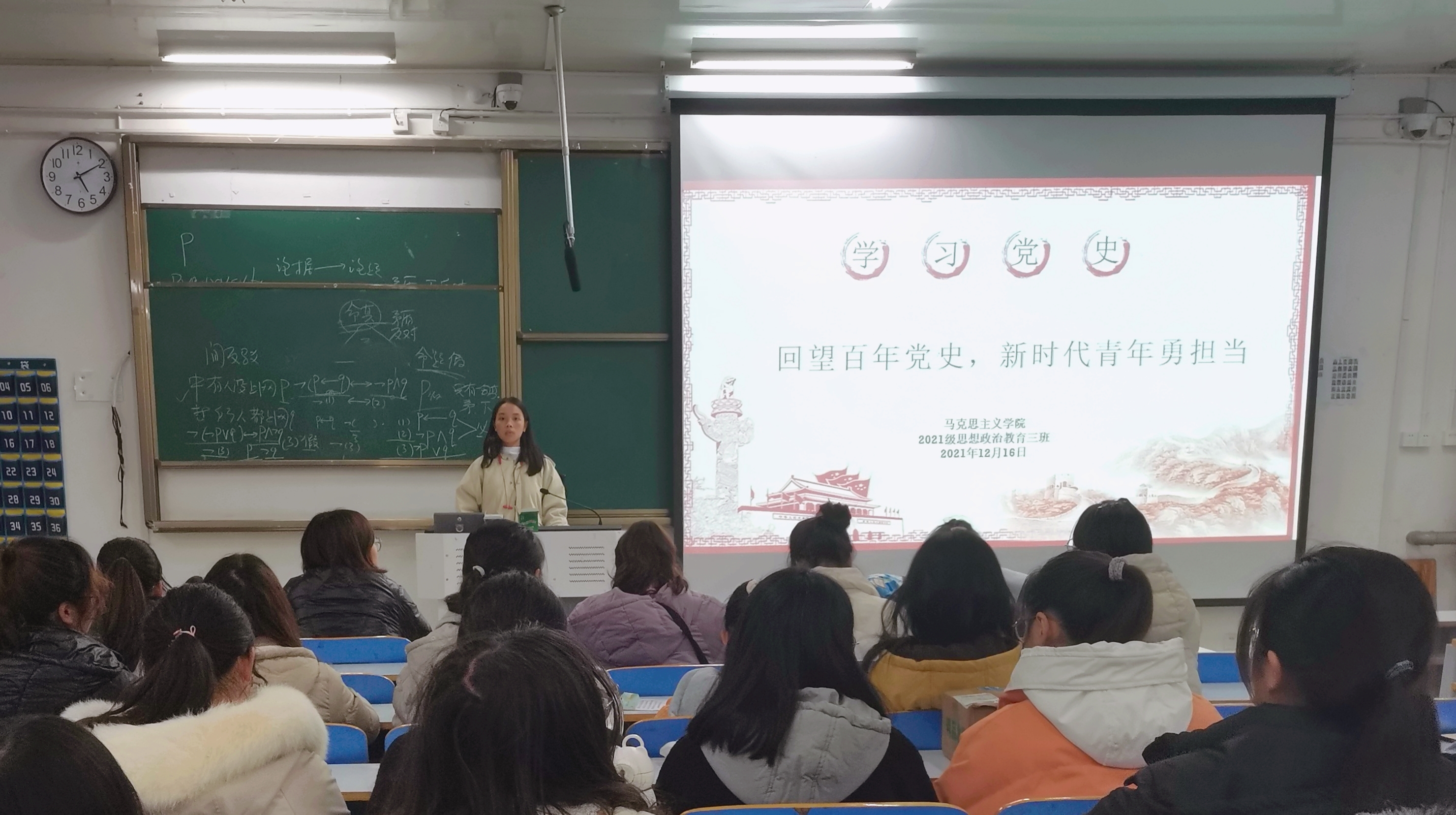 12月16日下午,beat365在线唯一官网2021级思想政治教育三班在社科楼514教室举办“回望百年党史,新时代青年勇担当”主题团课。2021级思想政治教育三班全体团员参加了此次团课。团课由团支部副书记王岚霄主持。