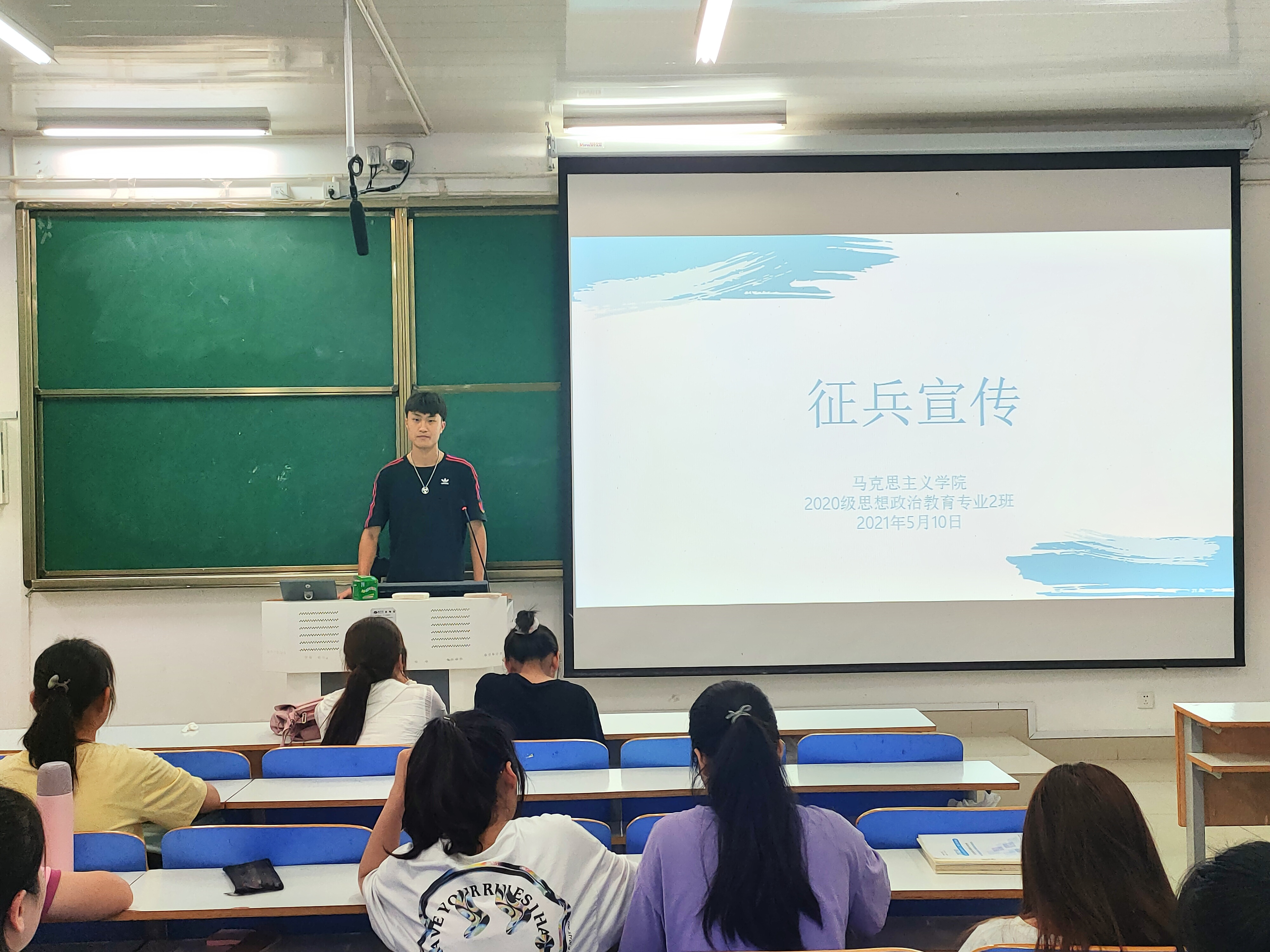 5月10日下午,beat365在线唯一官网2020级思想政治教育二班、定向二班在社科楼514教室顺利召开征兵宣传主题班会。2020级思想政治教育二班、定向二班全体学生共同参与本次班会。班会由班长陈宇航主持。