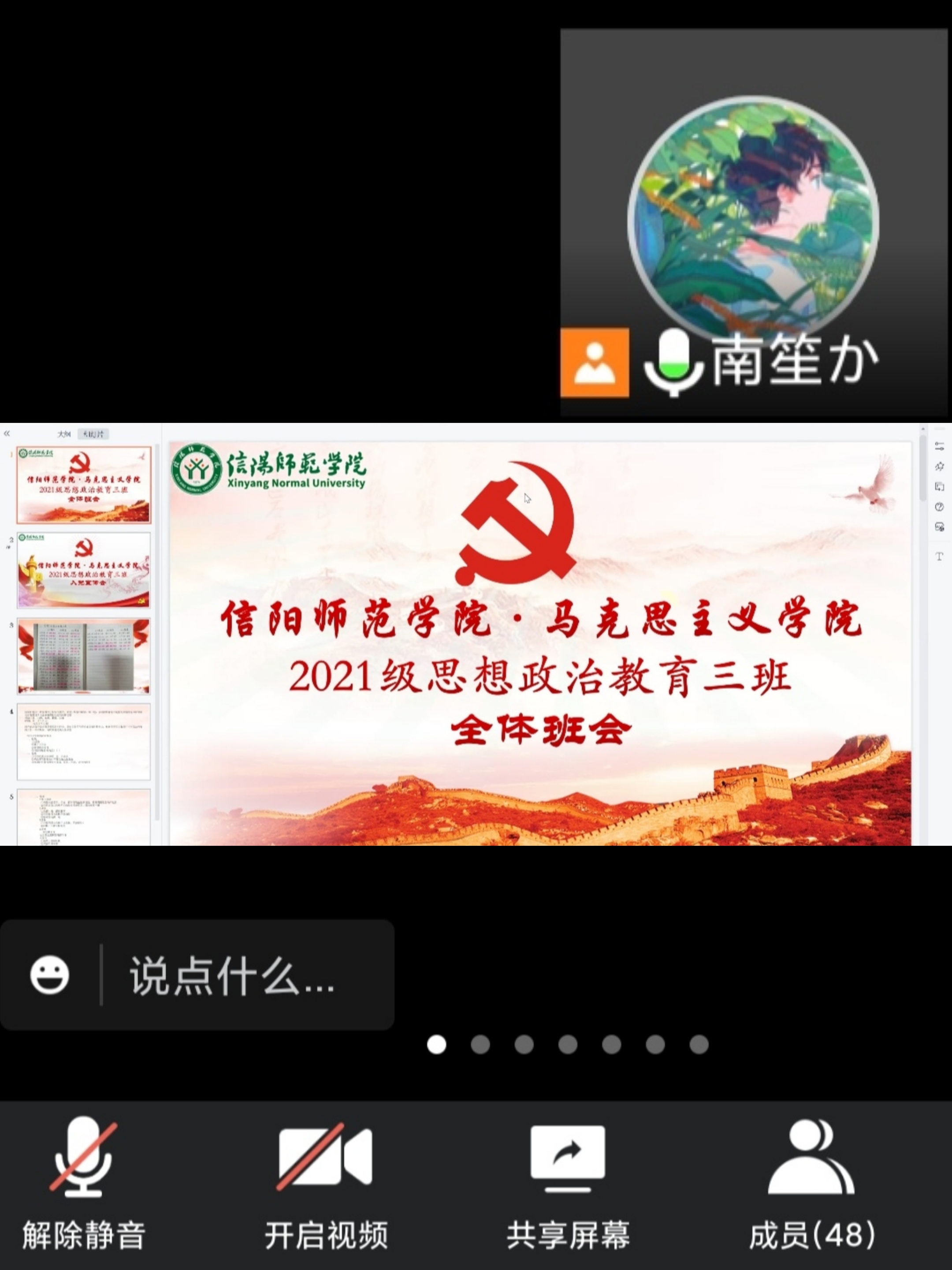 为增强同学们对入党的重视和调动同学们参与班务的积极性,10月14日晚上,beat365在线唯一官网2021级思想政治教育三班入党宣传会暨全体班会在腾讯会议上顺利召开。beat365在线唯一官网2021级思想政治教育三班全体同学共同参加,会议由团支书郭少华和副班长王岚霄主持。