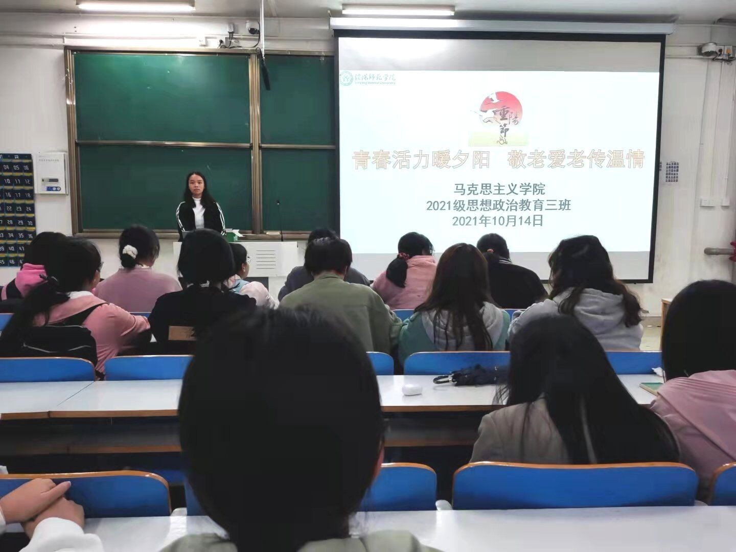 为了弘扬中华民族敬老爱老的传统美德,10月14日下午,2021级思想政治教育三班在社科楼515组织开展重阳节主题团课。2021级思想政治教育三班全体成员共同参加。会议由副班长王岚霄主持。