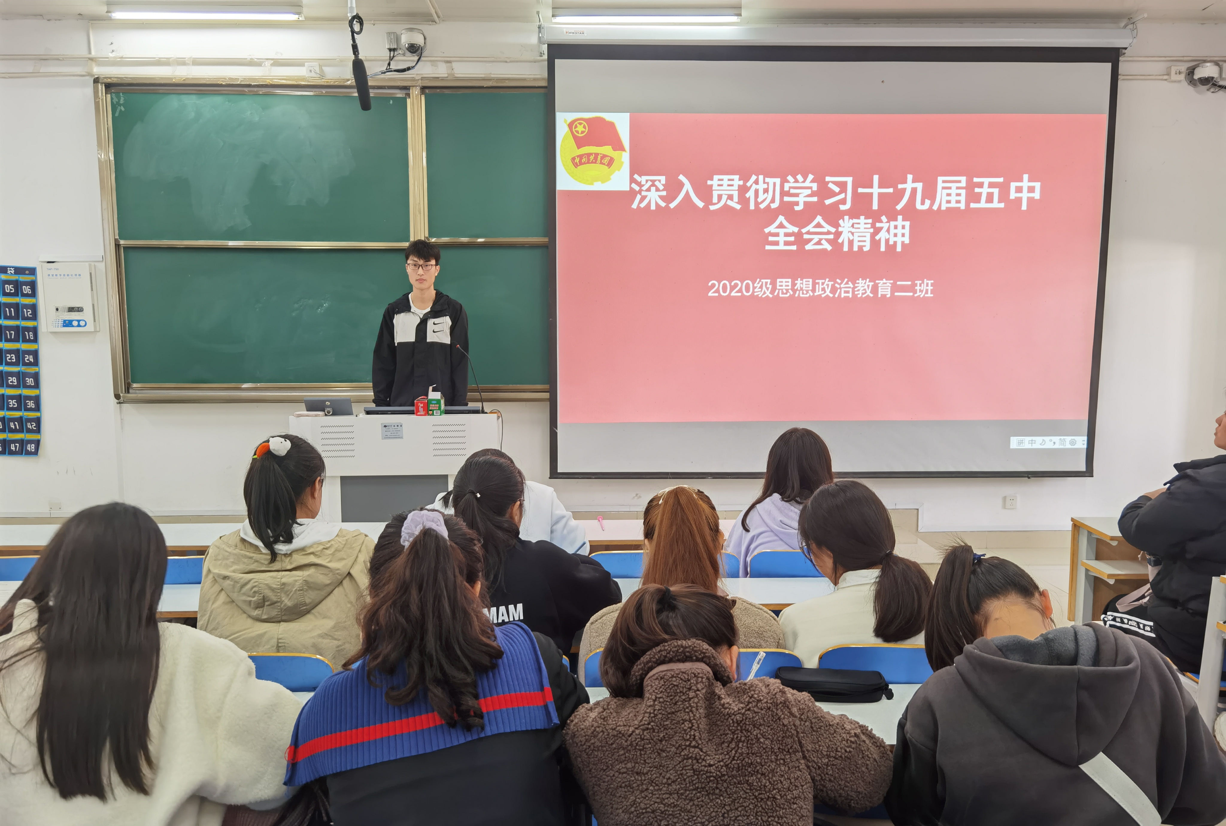 11月19日上午,beat3652020级思想政治教育二班在社科楼514教室开展学习贯彻十九届五中全会精神团日活动,2020级思想政治教育二班全体学生共同参与本次活动。活动由团支书陈宇航主持。