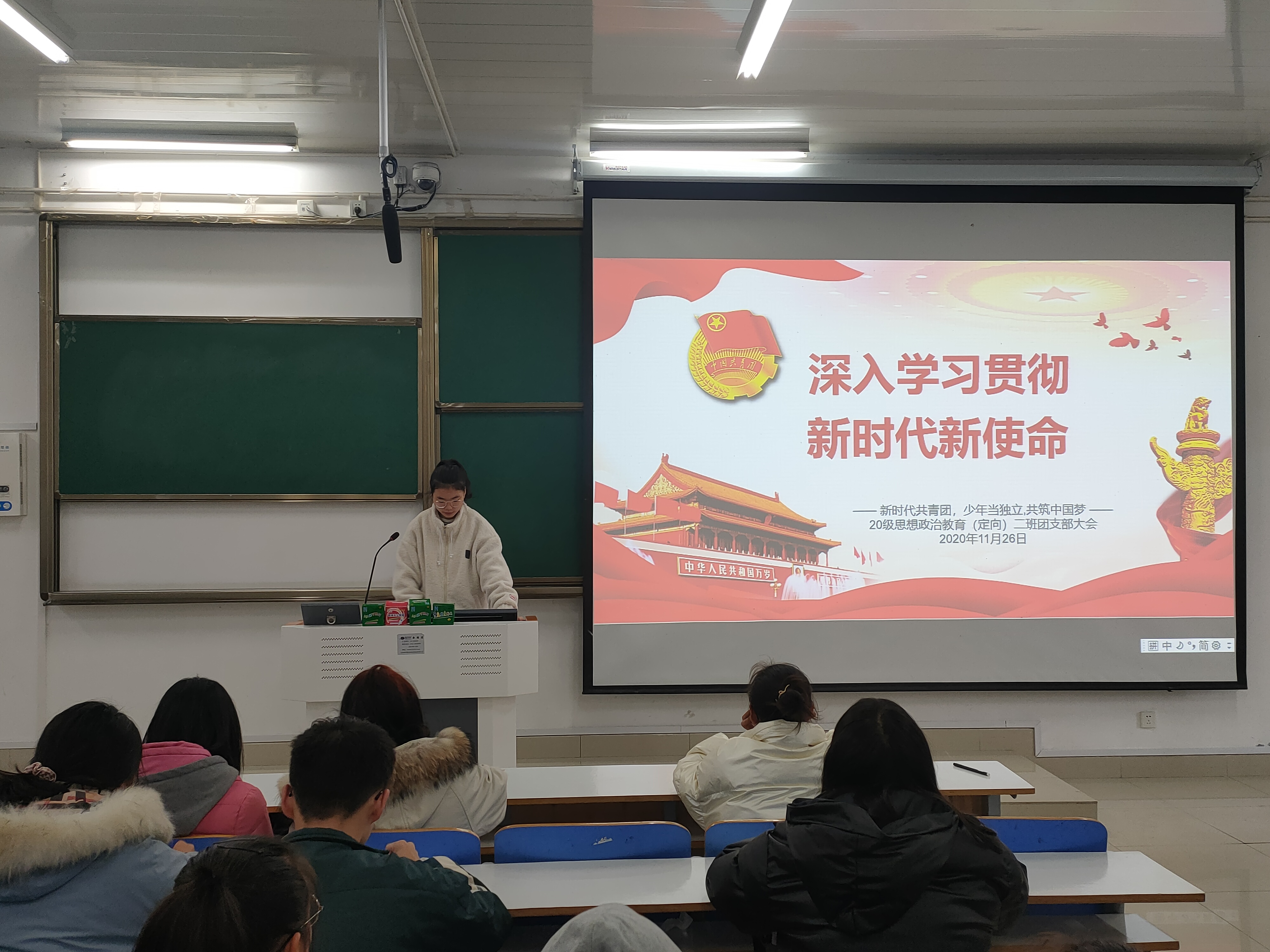 为促进同学们深入学习共青团知识,自觉担当新时代新使命,11月26日,beat365在线唯一官网2020级思想政治教育定向二班“担当新使命,共筑中国梦”主题团支部大会在社科楼514教室顺利召开。定向二班全体团员参与此次会议。大会由团支书李晨曦主持。
