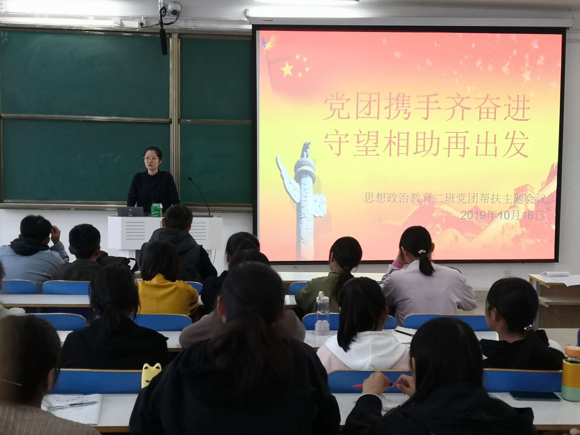 为提高2019级新生适应大学校园生活的能力,10月16日上午,beat365在线唯一官网2019级思想政治教育二班在社科楼514教室顺利开展党团帮扶班会。党团帮扶小组成员张雅琼、刘冰以及2019级思想政治教育二班全体同学共同参会。本次班会由团支书孙雅娴主持。