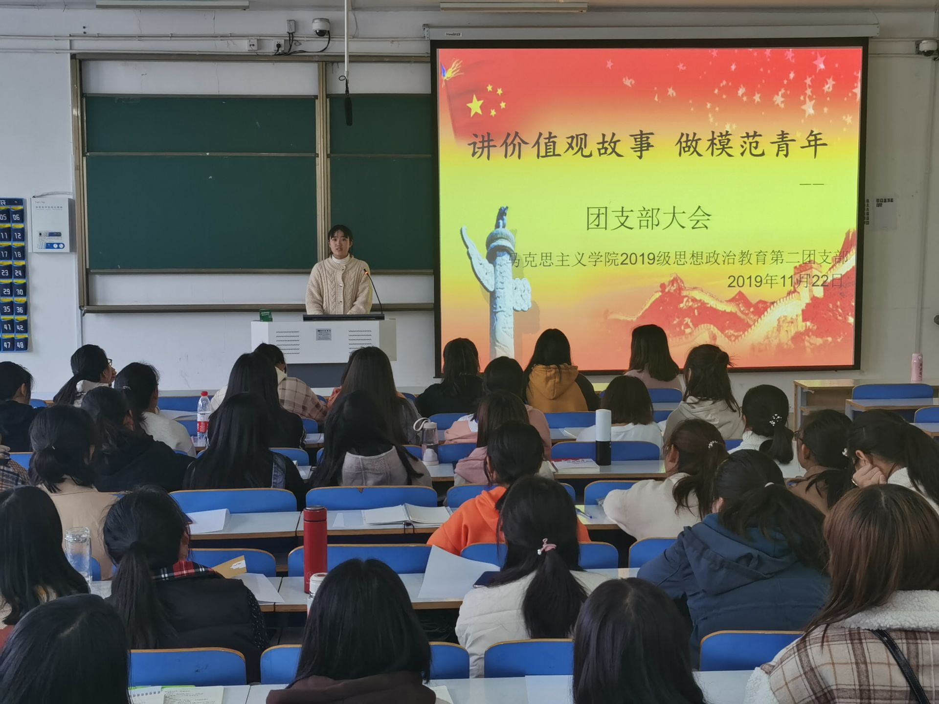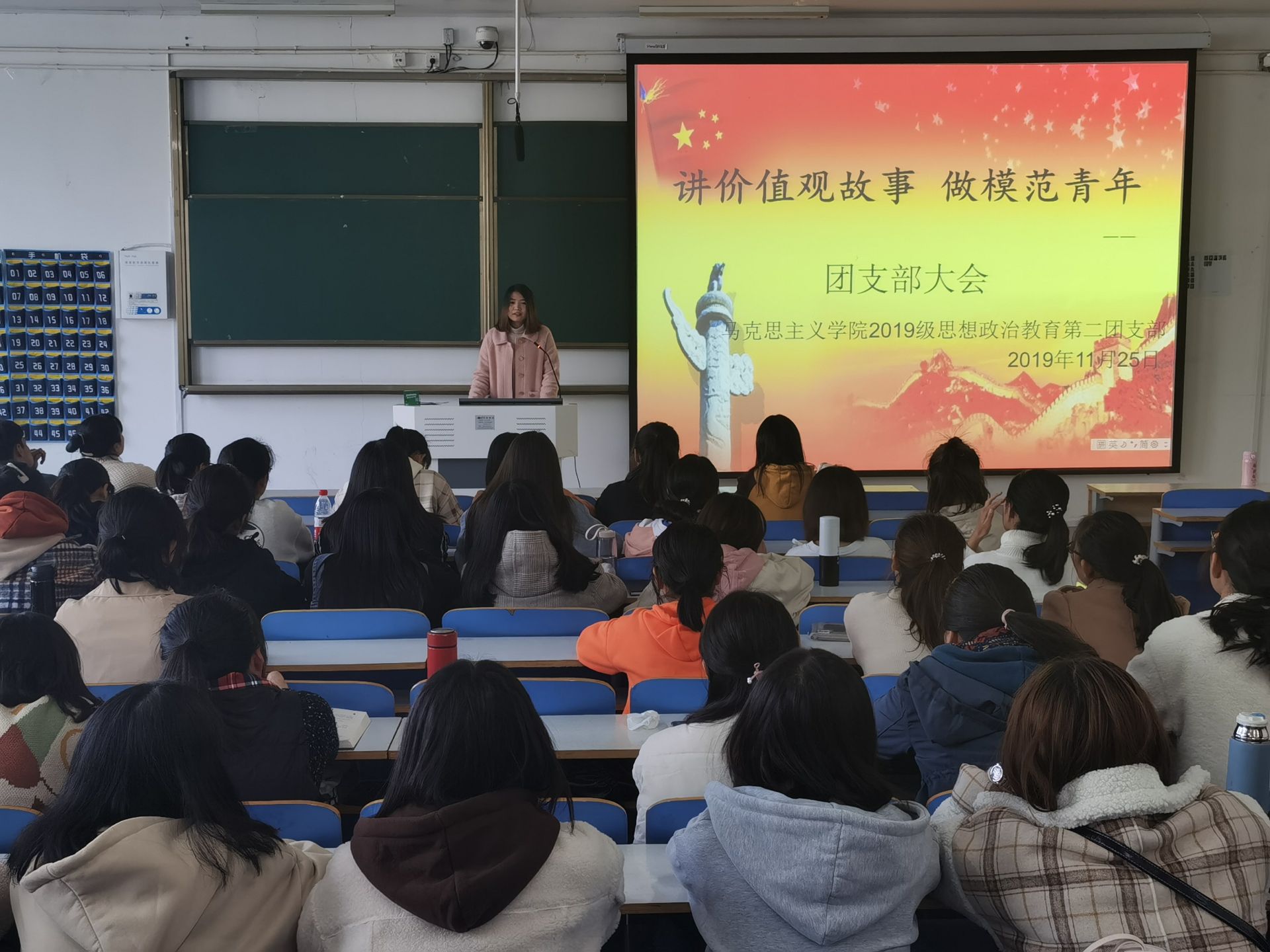 11月22日下午,beat365在线唯一官网2019级思想政治教育第二团支部在社科楼516教室顺利召开“讲价值观故事,做模范青年”团支部大会。团委老师陶青青及beat365在线唯一官网2019级思想政治教育第二团支部全体团员共同参会。会议由团支书孙雅娴主持。