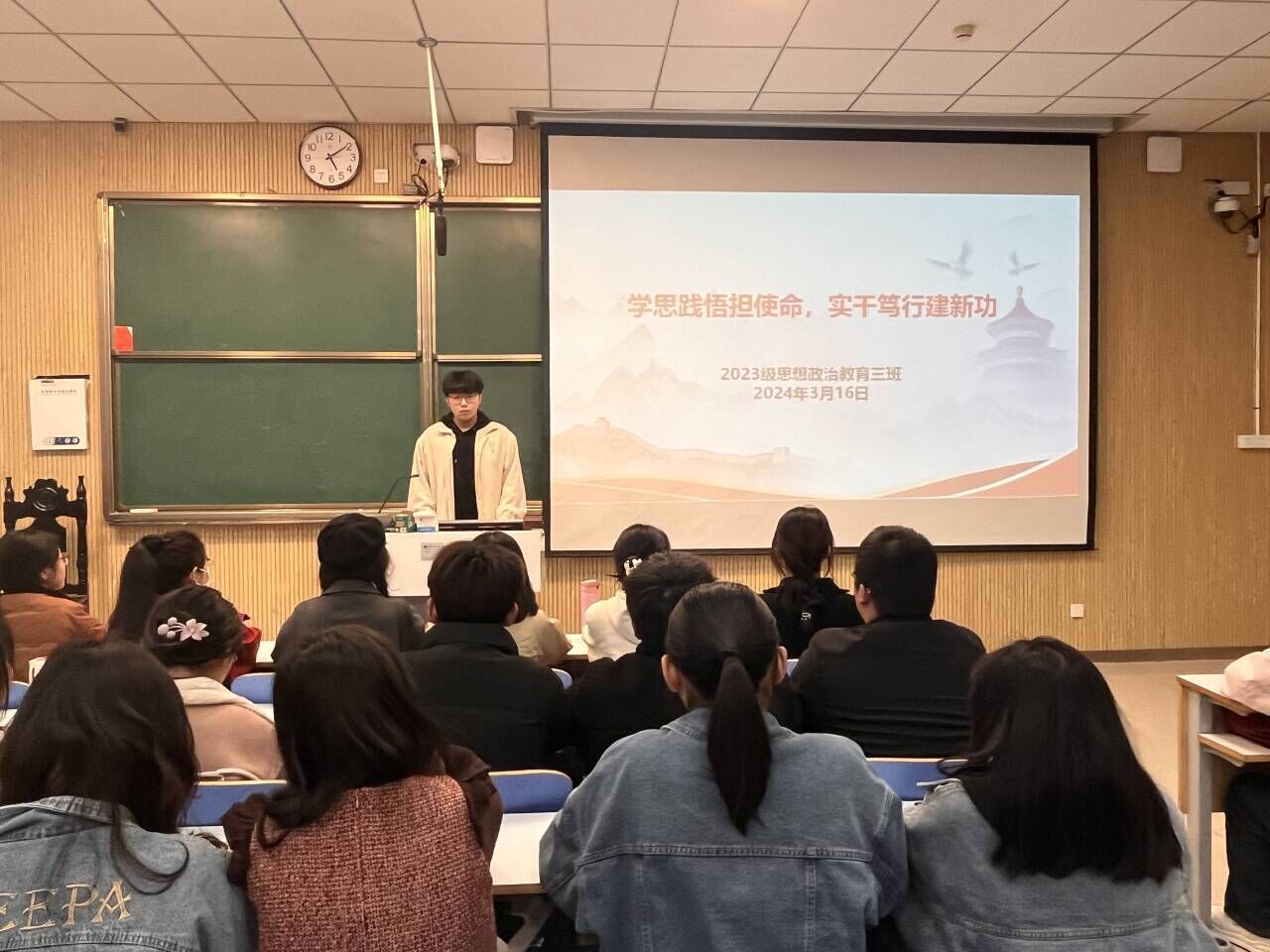 为深入学习贯彻习近平新时代中国特色社会主义思想,3月16日上午,beat365在线唯一官网2023级思想政治教育三班在社科楼515教室召开“学思践悟担使命,实干笃行建新功”主题团课。beat3652023级思想政治教育三班全体同学共同参与本次班会,班会由团支书郝瀚主持。