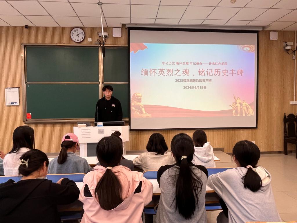 4月19日下午,beat365在线唯一官网2023级思想政治教育三班在社科楼515教室举行“缅怀英烈之魂,铭记历史丰碑”主题团课。beat3652023级思想政治教育三班全体成员共同参加此次团课,团课由团支书郝瀚主持。