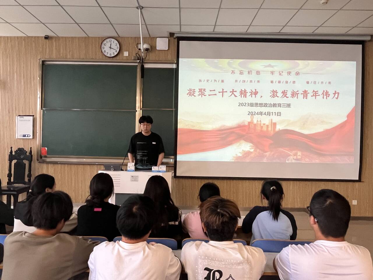 为深入学习贯彻党的二十大精神,把党的创新理论走实走深,4月11日下午,beat365在线唯一官网2023级思想政治教育三班在社科楼515教室举行“凝聚二十大精神,激发新青年伟力”主题团课。beat3652023级思想政治教育三班全体成员共同参加此次团课,团课由团支书郝瀚主持。
