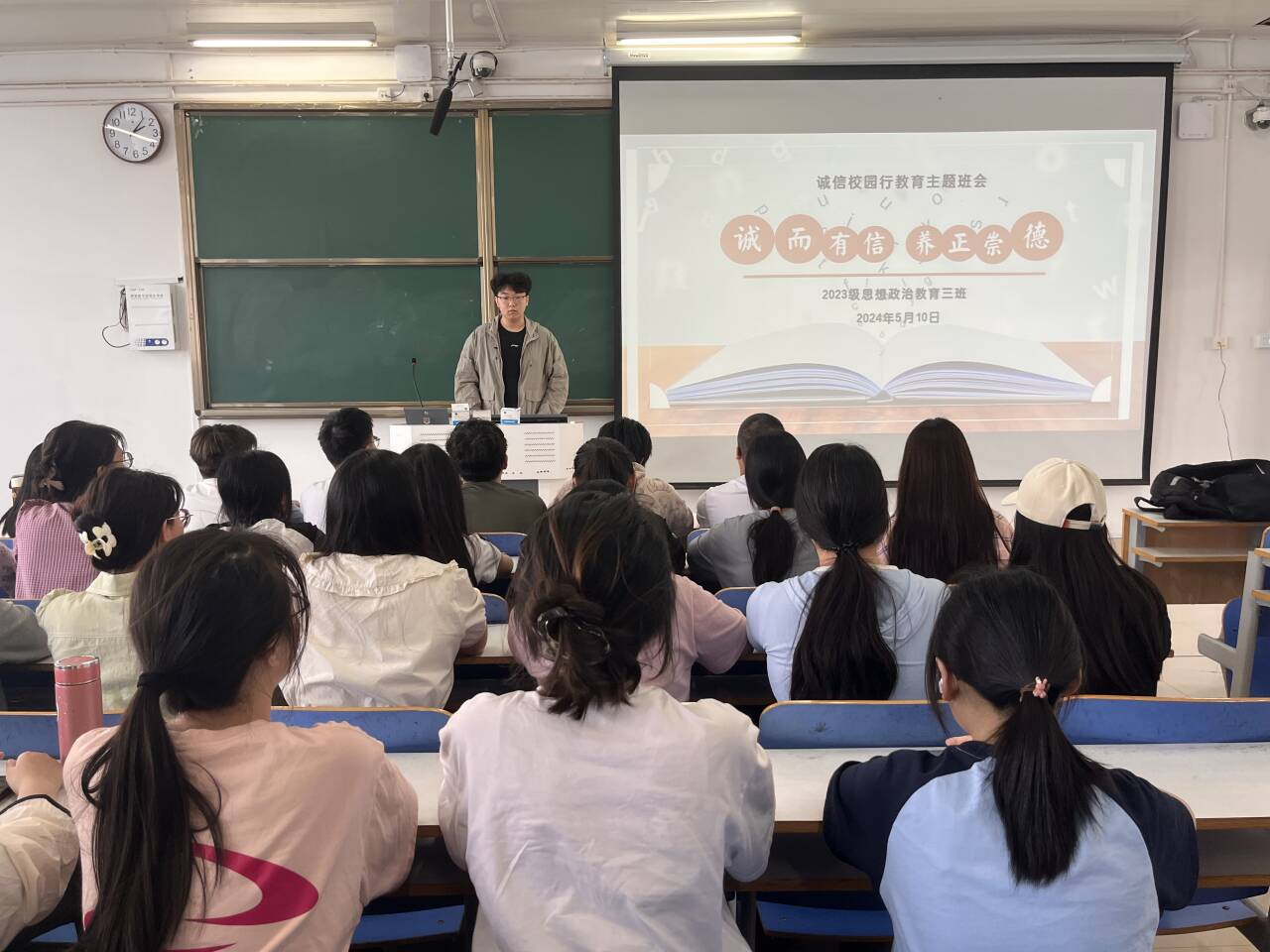 班会伊始,郝瀚以歌曲《诚信之歌》为切入点,引导学生理解诚信的含义。他指出,诚实,是指言行跟内心思想一致。守信,就是讲信用,不失信。接着,我班学子共同观看情景剧《一两都不能少》,该故事以卖水果为生的冉大平因缺斤少两,不讲诚信,被执法人员惩治,最终妻离子散,引出了诚信的重要性。随后,学生代表张亚蕾表示,诚信是一种品质、是一种态度,我们要从自身做起,以诚实守信的态度去面对生活中的每一个人,每一件事,只有这样,我们才能赢得他人的信任与尊重,树立良好的个人形象。最后,郝瀚做出总结,诚实守信是一个人立足社会的基础,也是一个人应有的基本道德品质。只有人人诚信,社会秩序才能有条不紊,文明进步才能畅通无阻。