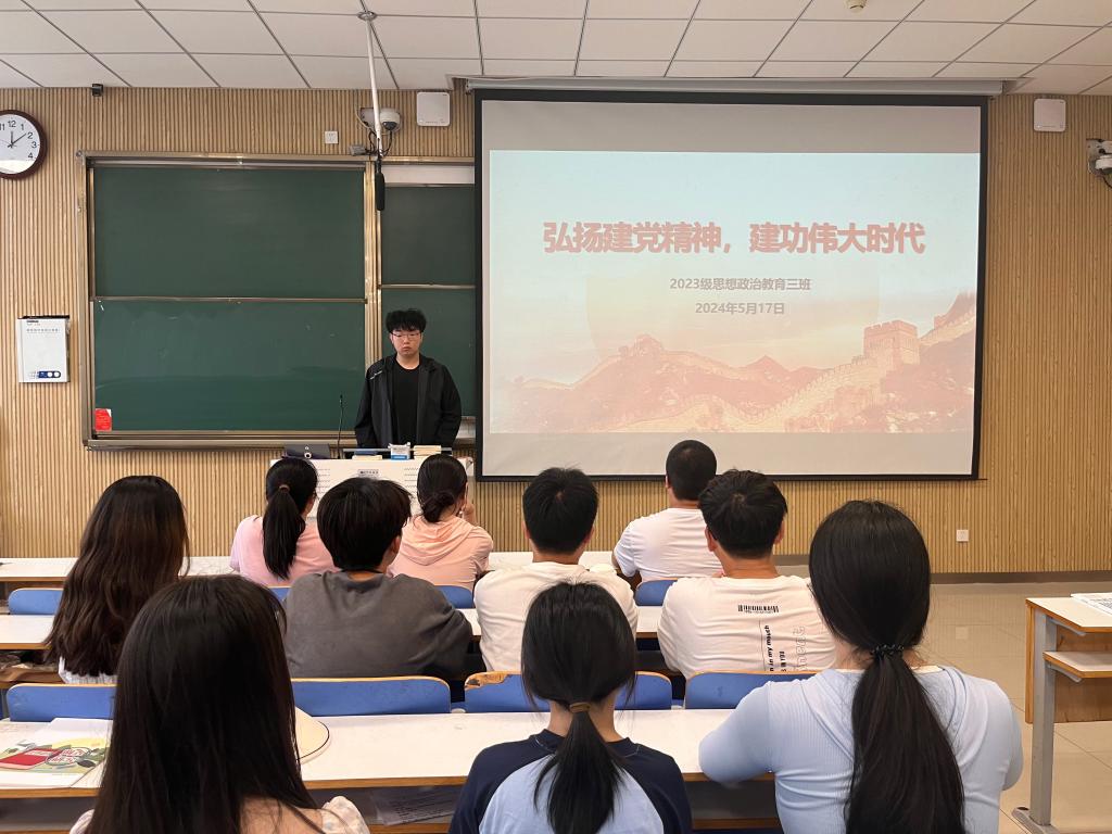 为弘扬伟大建党精神,走好新时代赶考之路,5月17日上午,beat365在线唯一官网2023级思想政治教育三班在社科楼515召开“弘扬建党精神,建功伟大时代”主题团课。beat3652023级思想政治教育三班全体同学共同参与本次团课,团课由团支书郝瀚主持。