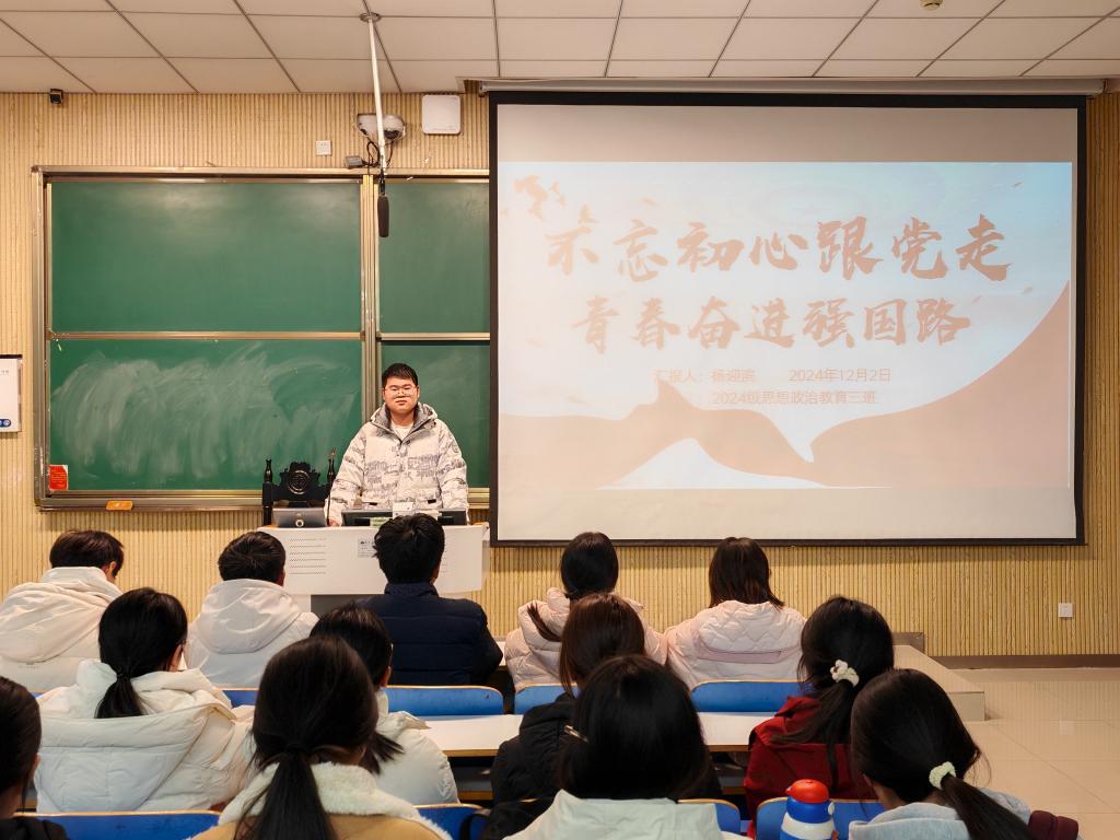为深入学习贯彻党的精神,引导广大青年学生坚定理想信念,beat365在线唯一官网2024级思想政治教育三班于12月2日在社科楼515教室成功举办了以“不忘初心跟党走,青春奋进强国路”为主题的团课活动。此次团课由团支书杨迎滨主持。
