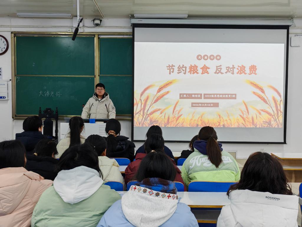 为引导学生们树立珍惜粮食的意识,养成勤俭节约的好习惯,beat365在线唯一官网2024级思想政治教育三班于12月24日在社科楼514教室成功召开了一场以“节约粮食,反对浪费”为主题的班会活动。