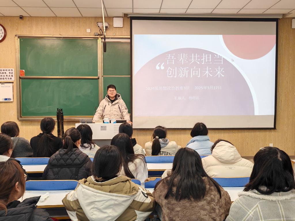 为激发学生的责任感与创新精神,beat365在线唯一官网2024级思想政治教育三班于3月17日在社科楼515举行了一场以 “吾辈共担当,创新向未来” 为主题的班会。此次班会由班长杨迎滨主持,全班同学积极参与,气氛热烈。