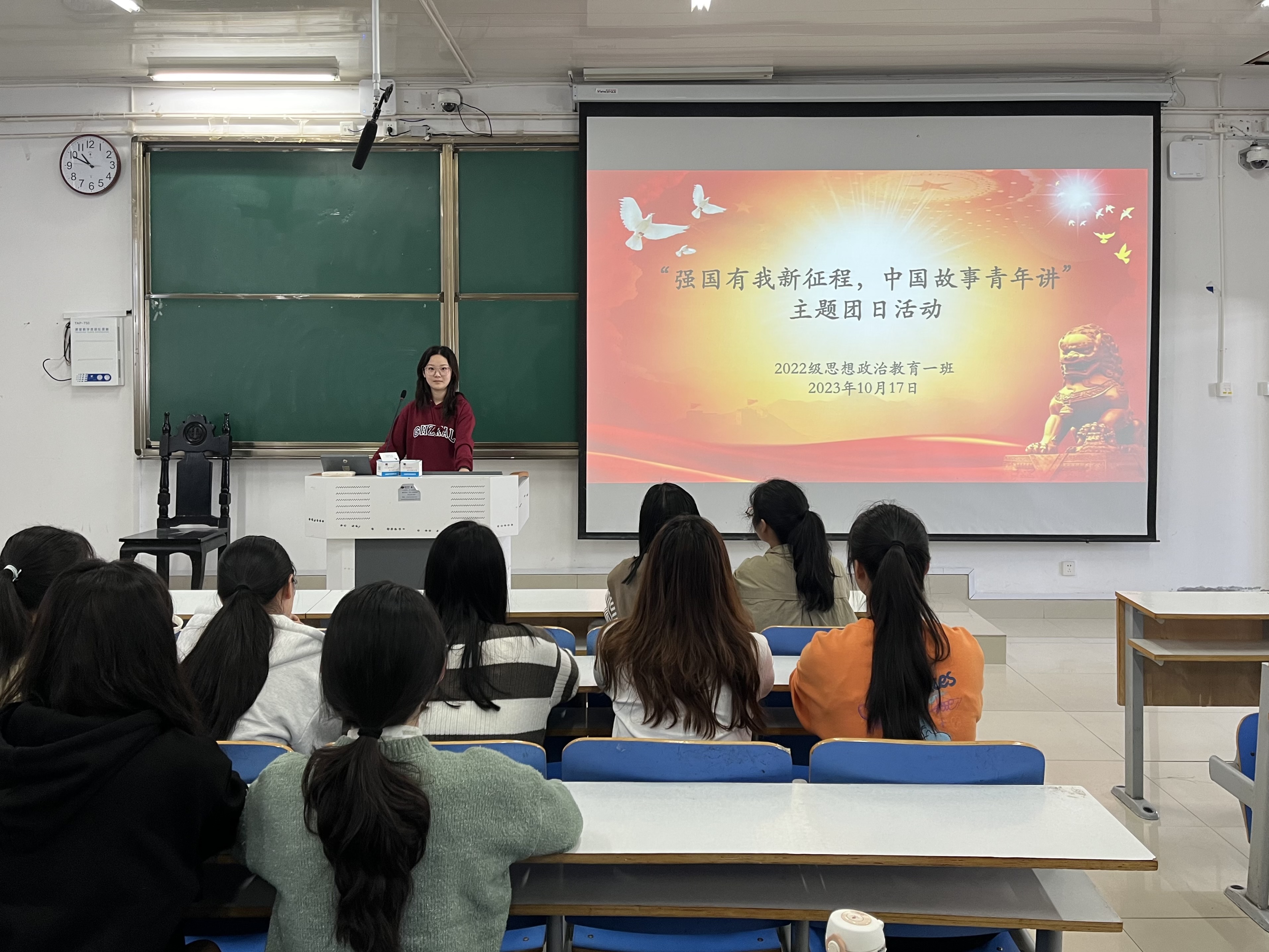 为深入学习中国青年爱国精神,10月17日上午,beat365在线唯一官网2022级思想政治教育一班在社科楼514教室召开“强国有我新征程,中国故事青年讲”主题团课。beat3652022级思想政治教育一班全体同学共同参与本次团课,团课由团支书李佳茹主持。