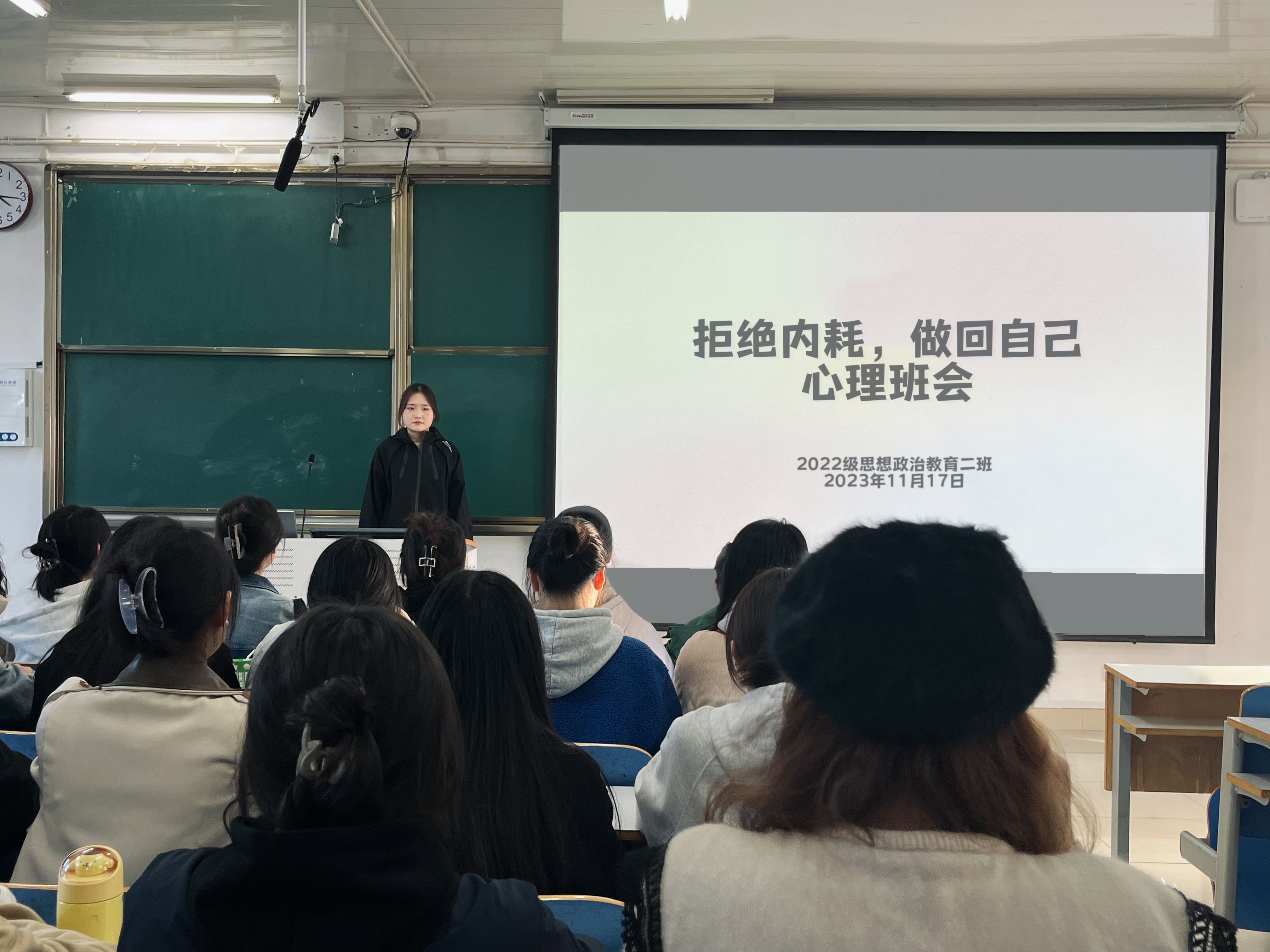 11月17日下午,beat365在线唯一官网2022级思想政治教育二班在社科楼514教室开展“拒绝内耗,做回自己”心理班会。beat3652022级思想政治教育二班全体成员共同参与此次心理班会。班会由心理委员张嘉芮主持。