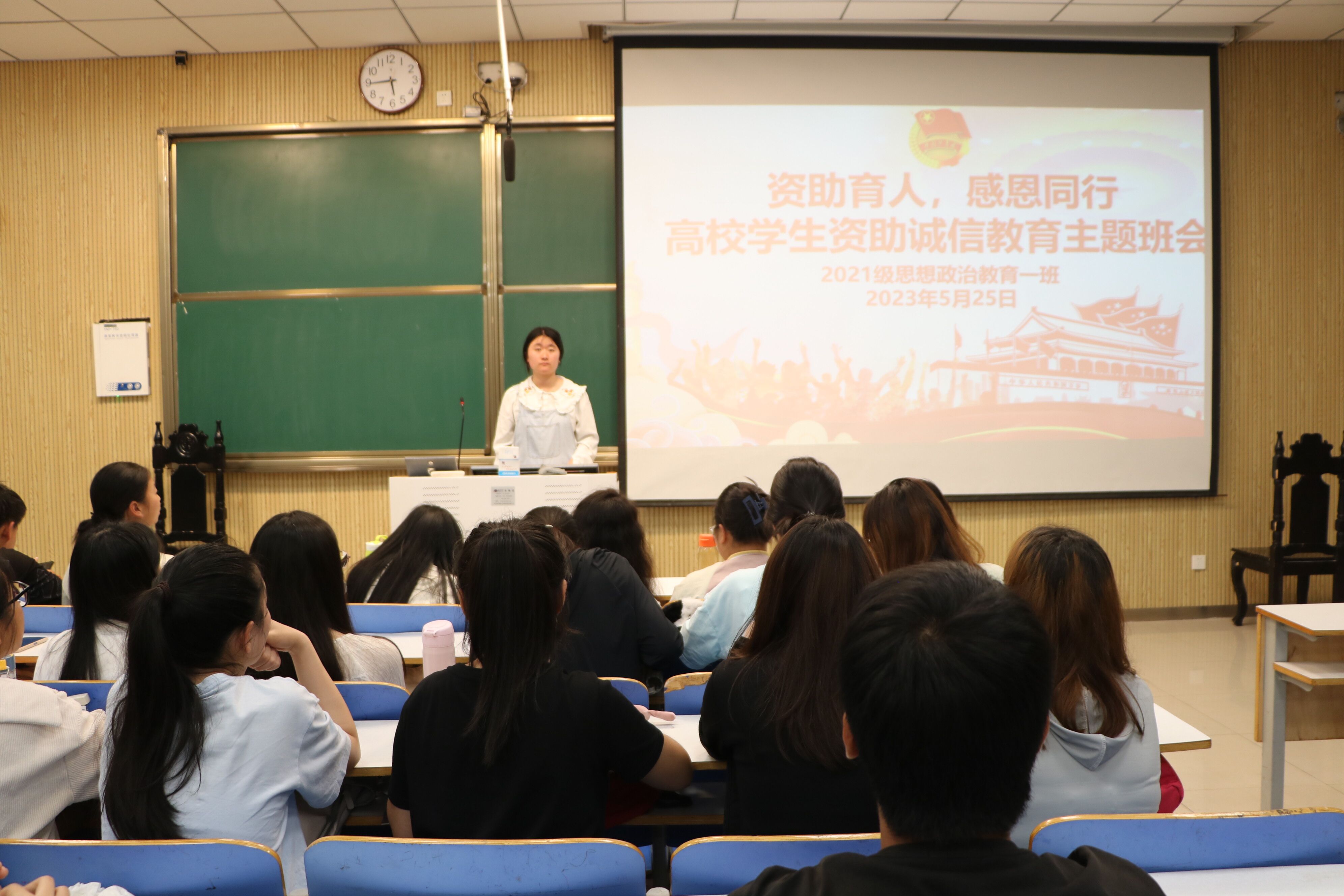 5月25日下午,beat365在线唯一官网2021级思想政治教育一班在社科楼514教室召开“资助育人,感恩同行”高校学生资助诚信教育主题班会。2021级思想政治教育一班全体成员共同参加了本次班会,班会由副班长雷敏主持。