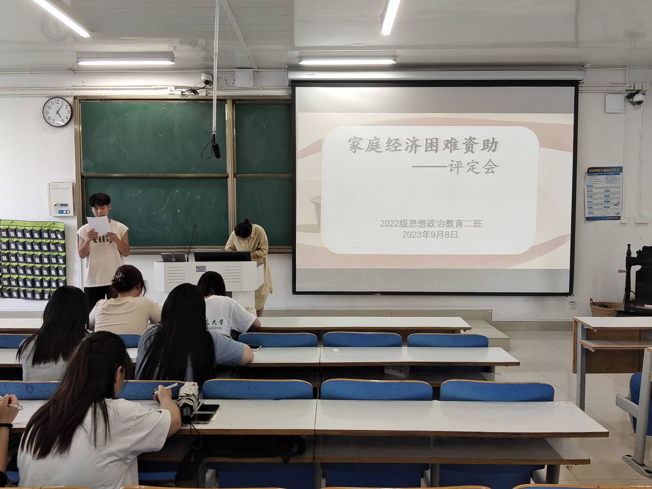 9月8日下午,beat365在线唯一官网2022级思想政治教育二班在社科楼514教室召开“家庭经济困难资助评定会”。beat3652022级思想政治教育二班杨春艳老师和全体同学参与本次评议会。副班长柴智森主持本次会议。
