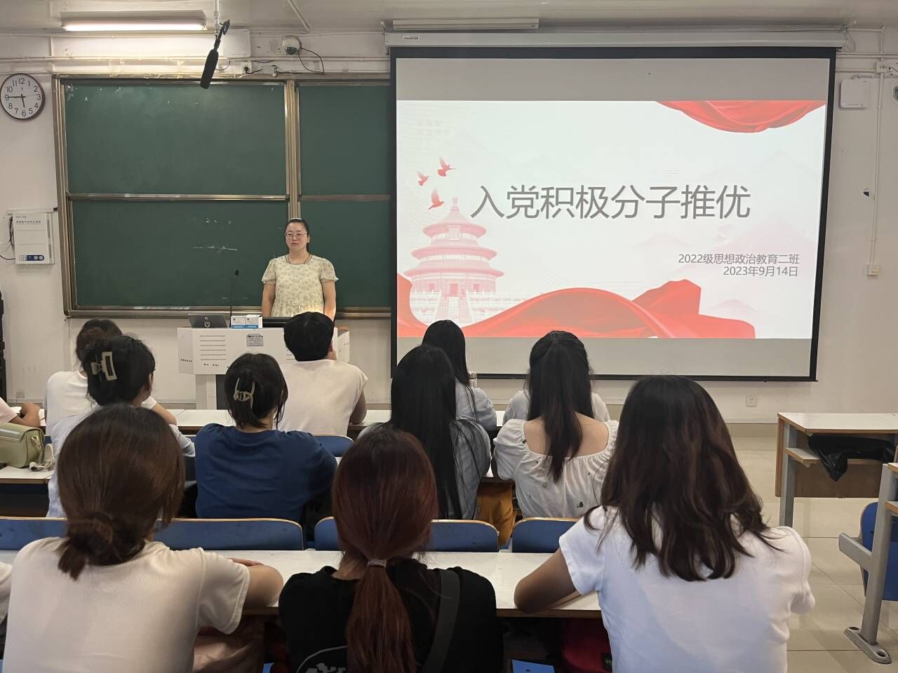 9月14日下午,beat365在线唯一官网2022级思想政治教育二班在社科楼514教室召开入党积极分子推优大会。beat3652022级思想政治教育二班杨春艳老师和全体同学参与本次班会。班会由团支书李佳音主持。