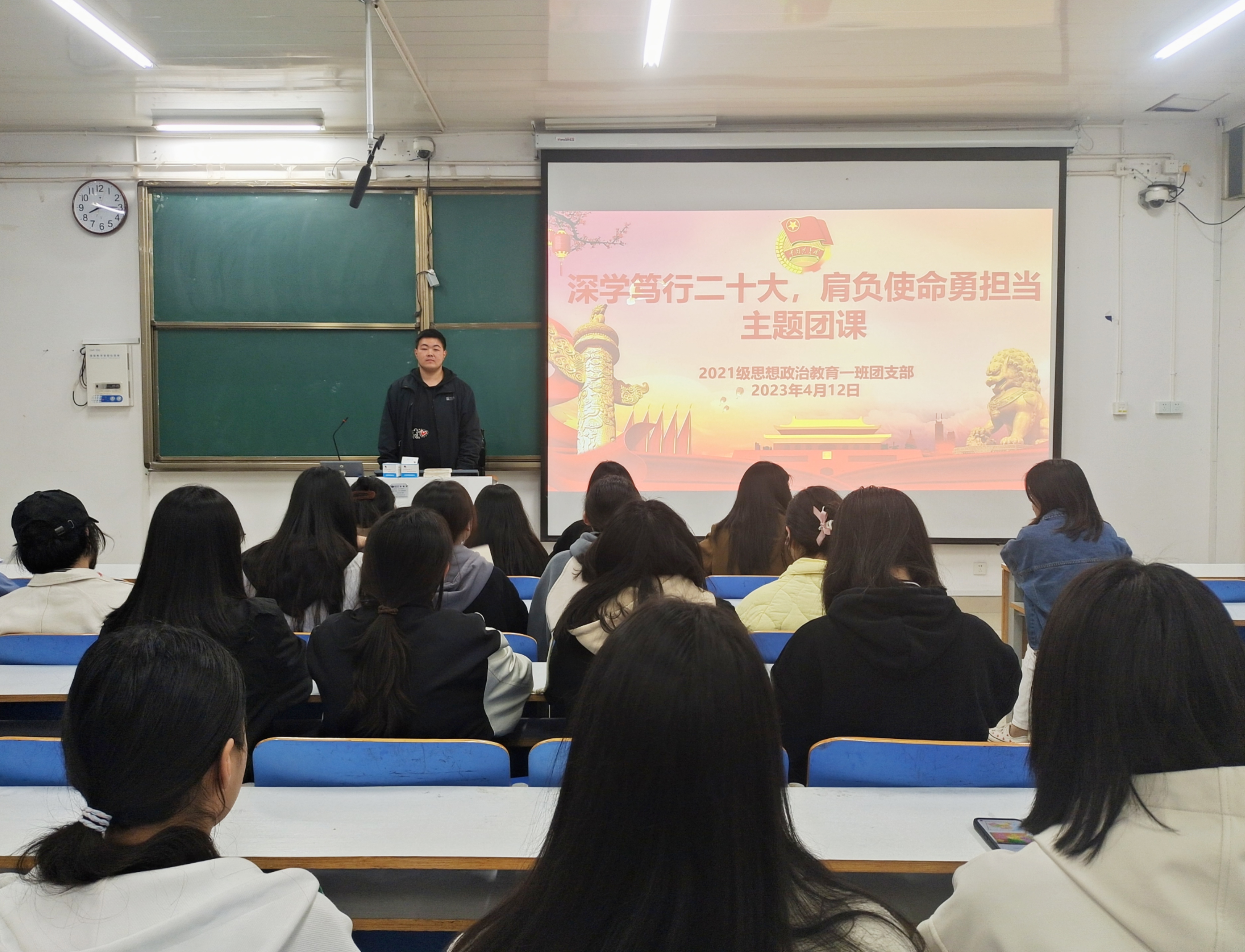 为强化对青年团员的思想政治引领,引导动员青年团员学习党的二十大精神,坚定跟党走,建功新时代,4月12日晚上,beat365在线唯一官网2021级思想政治教育一班在社科楼514教室召开“学习笃行二十大,肩负使命勇担当”主题团课。2021级思想政治教育一班全体团员参加了本次团课。团课由团支书戴翰林主持。