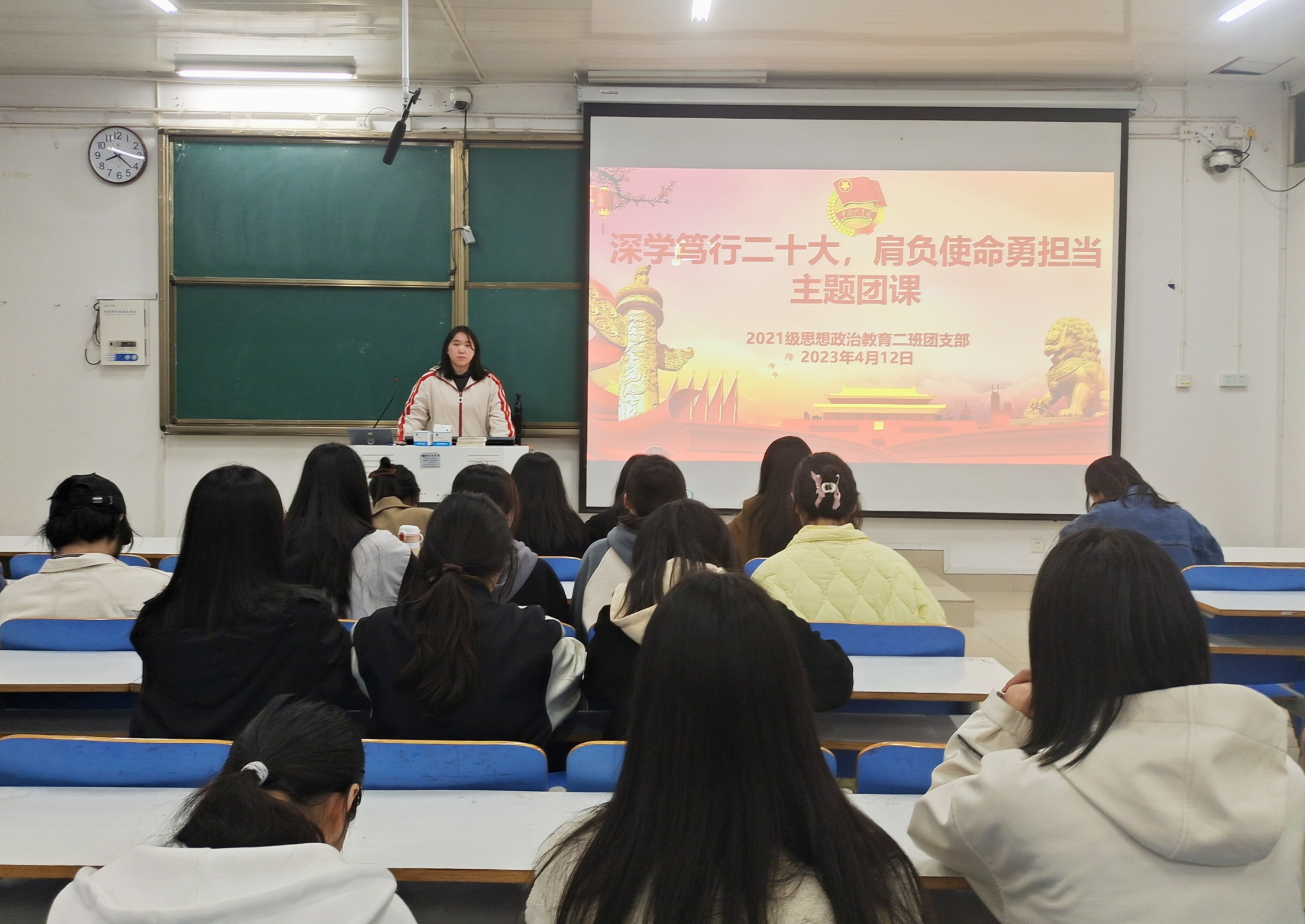 4月12日下午,beat365在线唯一官网2021级思想政治教育二班在社科楼514教室召开“深学笃行二十大,肩负使命勇担当”主题团课。2021级思想政治教育二班全体团员参加此次团课。团课由团支书王婧欣主持。