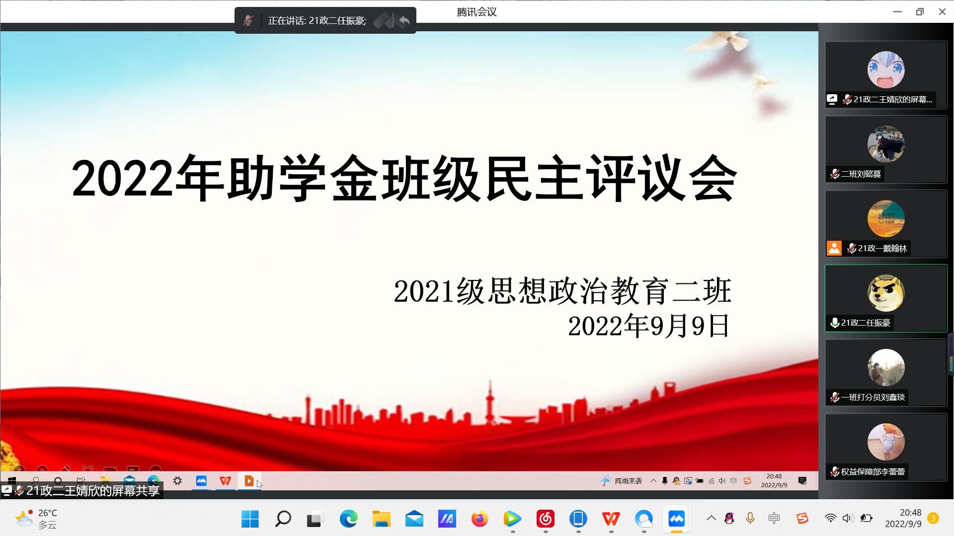 9月9日晚上,beat365在线唯一官网2021级思想政治教育二班在腾讯会议召开线上2022年助学金班级民主评议会。2021级思想政治教育二班评议小组成员及辅导员曹菁菁参加此次会议。会议由团支书王婧欣主持。