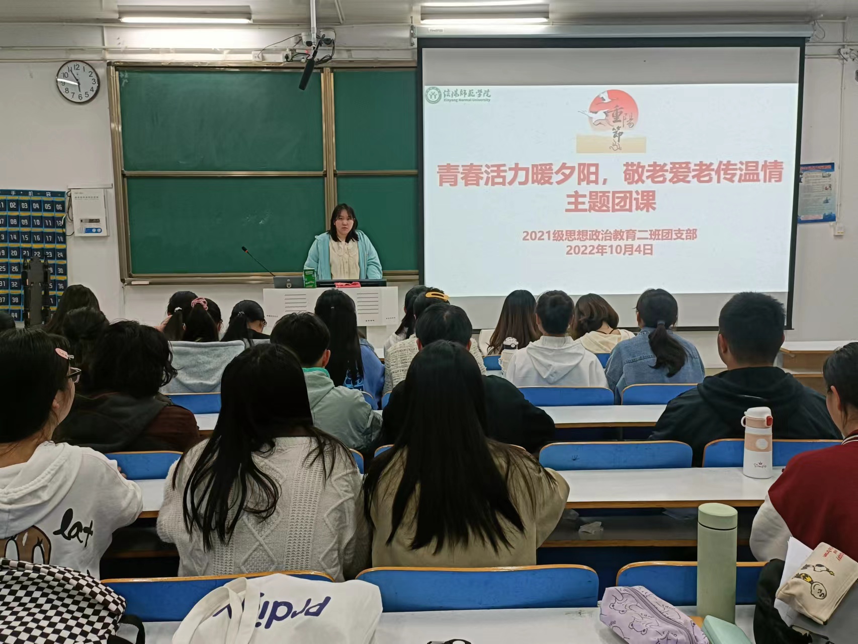 10月4日上午,beat365在线唯一官网2021级思想政治教育二班在社科楼514教室召开“青春活力暖夕阳,敬老爱老传温情”主题团课。2021级思想政治教育二班全体团员参加此次团课。团课由团支书王婧欣主持。