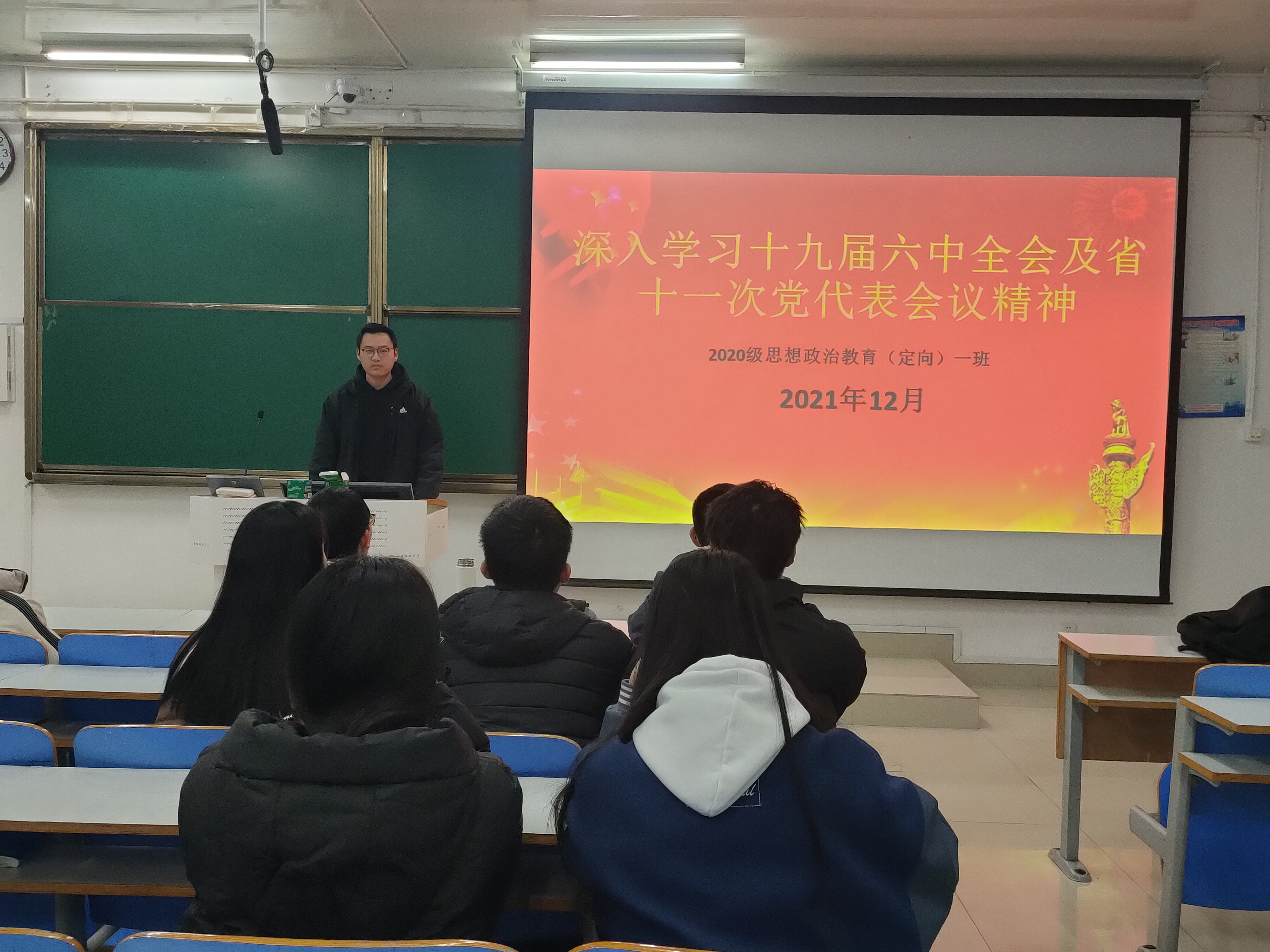 12月5日下午,beat365在线唯一官网2020级思想政治教育定向一班团支部在社科楼514教室举办了深入学习党的十九届六中全会及省第十一次党代会精神主题团课。beat365在线唯一官网2020级思想政治教育定向一班团支部全体成员参与了本次团课。