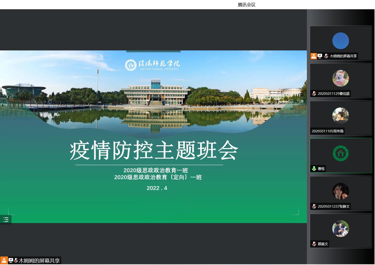 4月3日晚上,beat365在线唯一官网2020级思想政治教育一班、定向一班在腾讯会议上顺利召开疫情防控主题班会。2020级思想政治教育一班、定向一班全体同学参加此次会议,会议由辅导员曹栋主持。