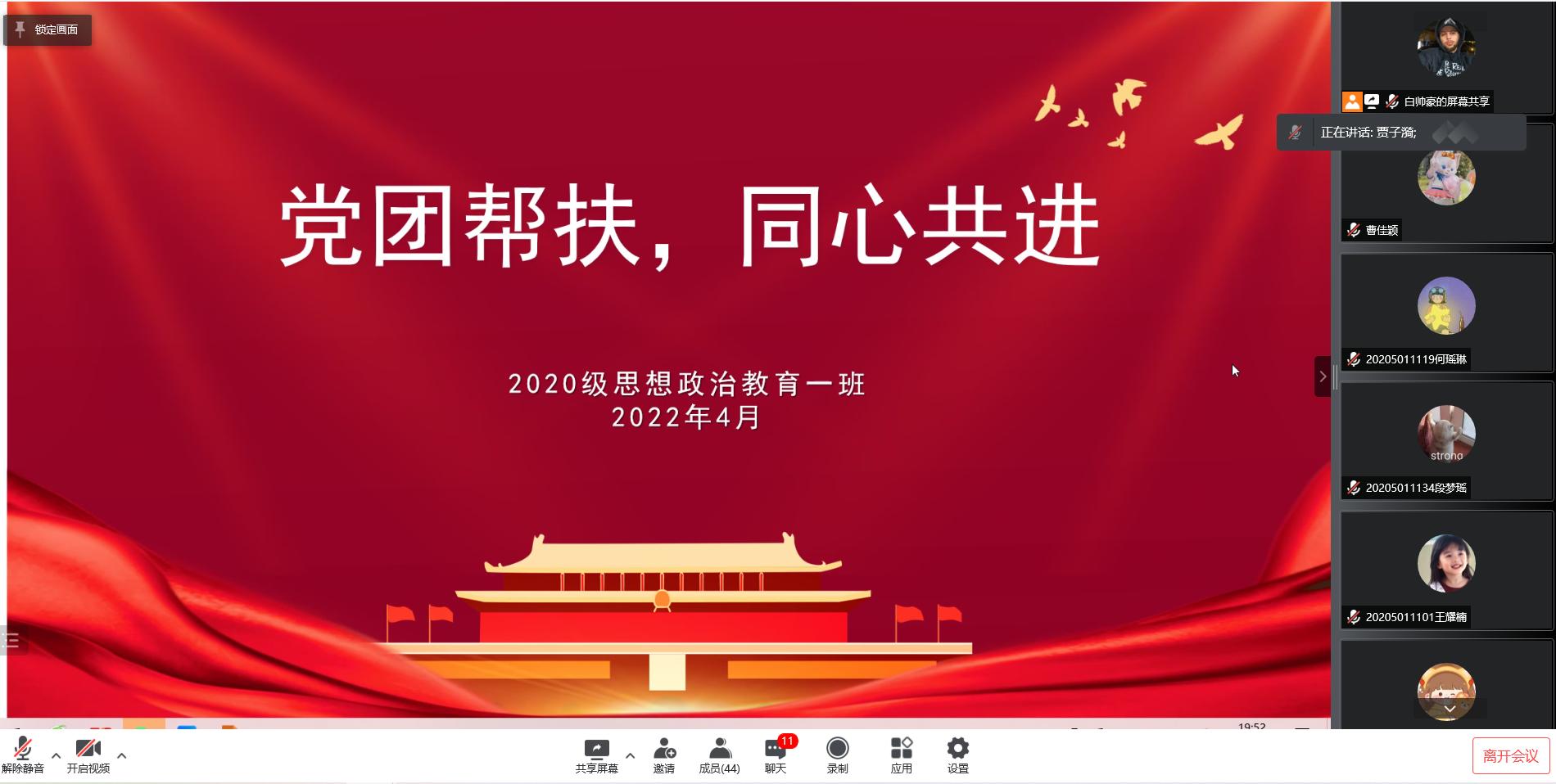4月25日晚,beat365在线唯一官网2020级思想政治教育一班在腾讯会议上顺利开展“党团帮扶,同心共进”活动。beat365预备党员贾子漪与2020级思想政治教育一班全体同学参加了本次活动,活动由团支部副书记白帅豪主持。
