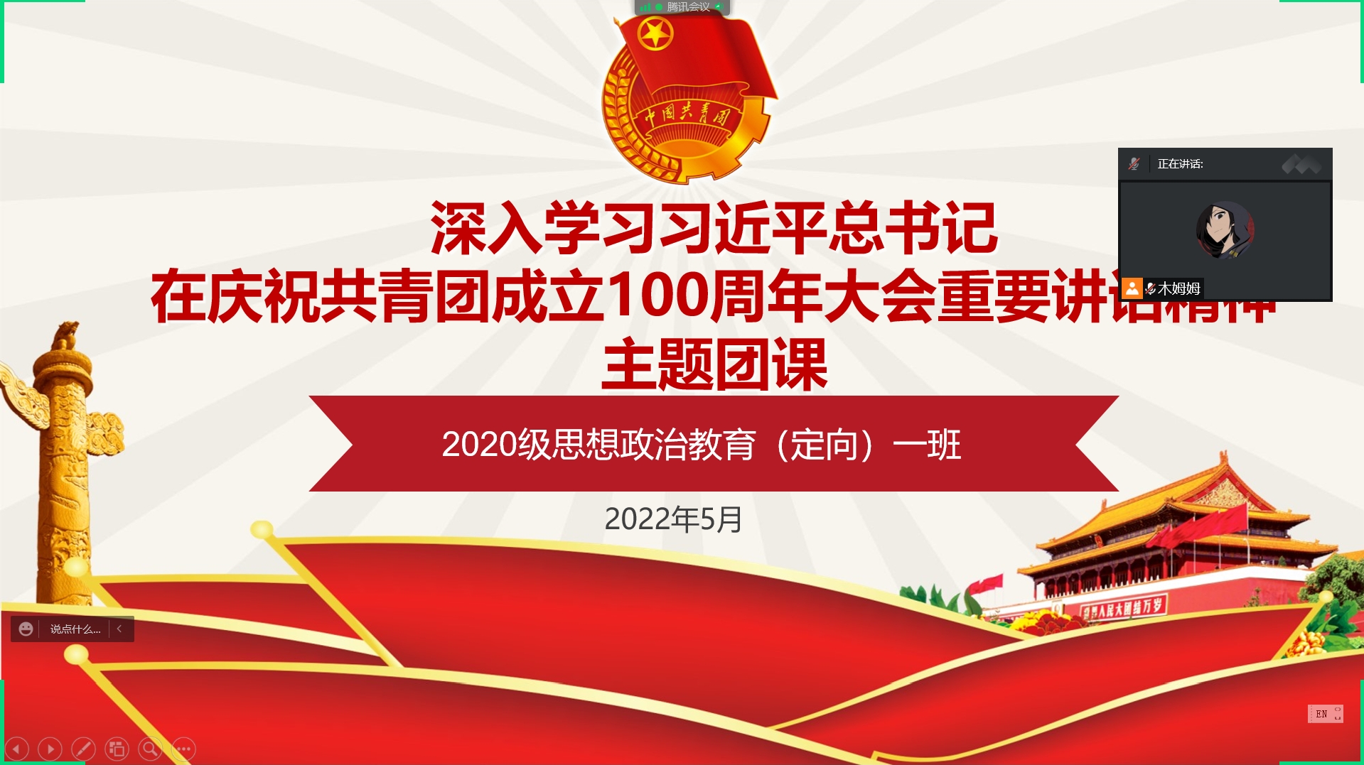 5月17日晚,beat365在线唯一官网2020级思想政治教育定向一班通过线上的形式开展了“深入学习习近平总书记在庆祝共青团成立100周年大会重要讲话精神”主题团课。