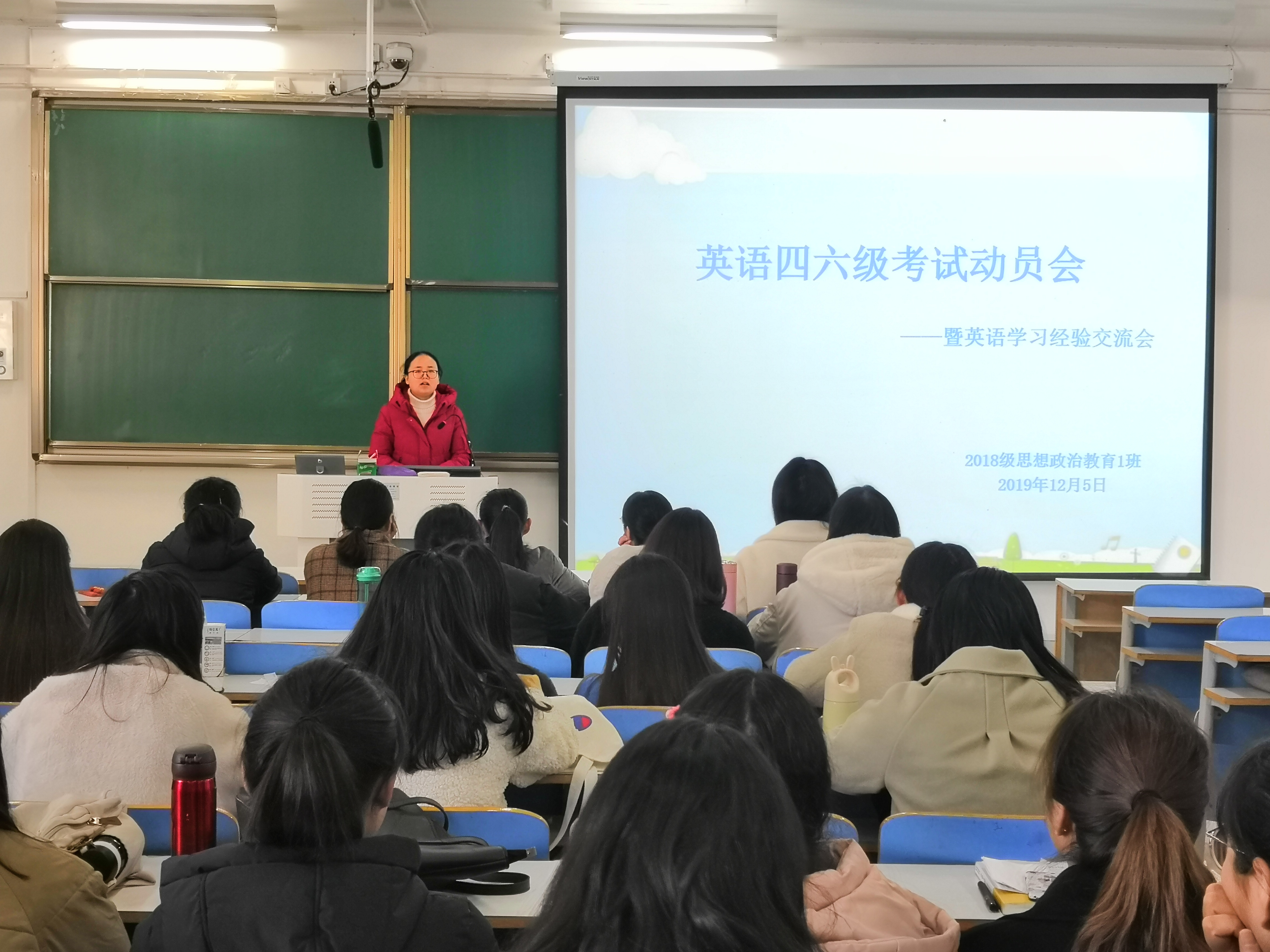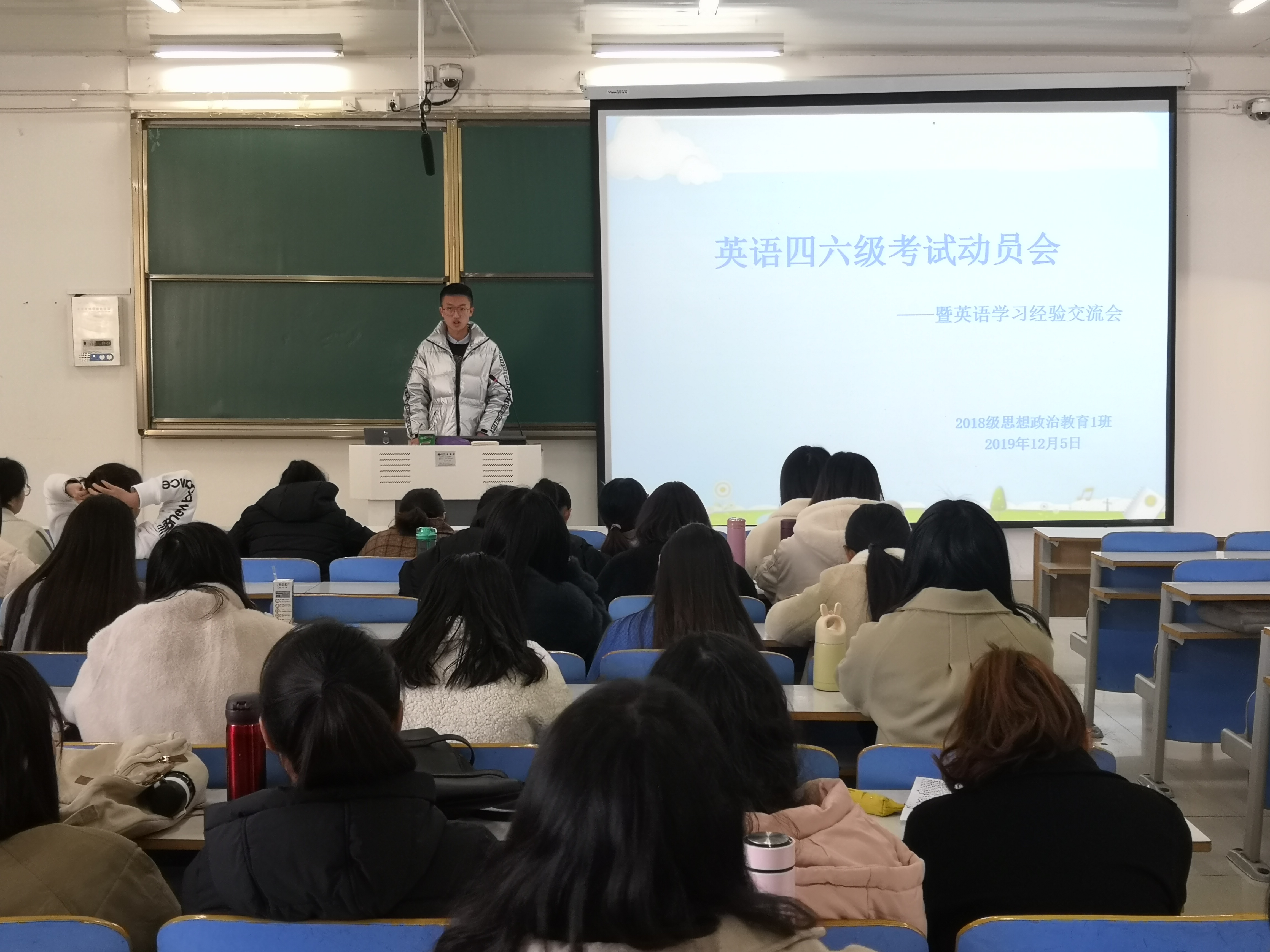 12月5日上午,beat365在线唯一官网2018级思想政治教育一班在社科楼514教室顺利开展英语四六级考试动员会。2018级思政一班全体同学共同参加此次会议。此次会议由班长邢子豪主持。