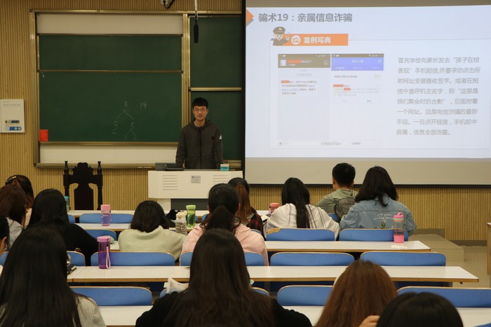 首先,邹创采用播放幻灯片、举案例的形式向同学们解释什么是电信诈骗,电信诈骗的途径及特点。他讲述了电信诈骗的几种常见类型、如何识别电信诈骗以及上当后的补救措施。邹创嘱咐同学们提高警惕,吸取经验教训,努力识别各种形式的骗局,最大限度保障自己的人身财产安全。尤其是在与陌生人接触时,切勿轻信他人,更不要相信天上掉馅饼的“好事”。