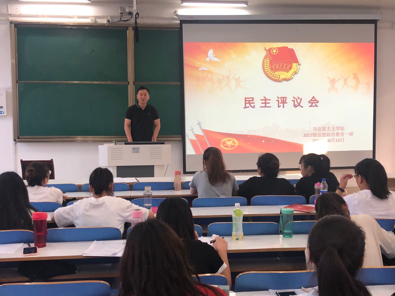 此次班会主要是通过班委述职、班级同学给予评价的方式,交流本学期班级建设情况,讨论改进措施。首先,班级干部给同学发放班干部评分建议表,同学匿名评价班干部,并提出自己的建议。其次,团支书谢文静、团支书副书记邹创、组织委员吴亦昕、学习委员曲新宇、宣传委员毛燕、劳动委员康晨光、文体委员崔亚婷、生活委员兼心理委员贾宁宁轮流述职。班委会依次针对班级工作中取得的成绩、存在的问题进行客观阐述,全面分析并评价自身工作,对未来的学习工作加以展望。随后,邹创对本学期的班级工作进行总结,他提出,一个团结、民主的班集体构建离不开同学们的积极参与,欢迎大家积极参与班级内部事务管理,为班级的发展贡献力量。最后团委老师曹栋对会议内容进行归纳,并指导同学调整学习工作心态,他指出同学们要相互理解,相互支持;要开拓眼界,放宽格局;要做好自己的定位和规划,把握好大学生活。会后,班委对同学们提出的意见进行整理总结并做出相关反馈,表明日后工作将会更加尽职尽责,更加贴近同学们的意愿和需求。