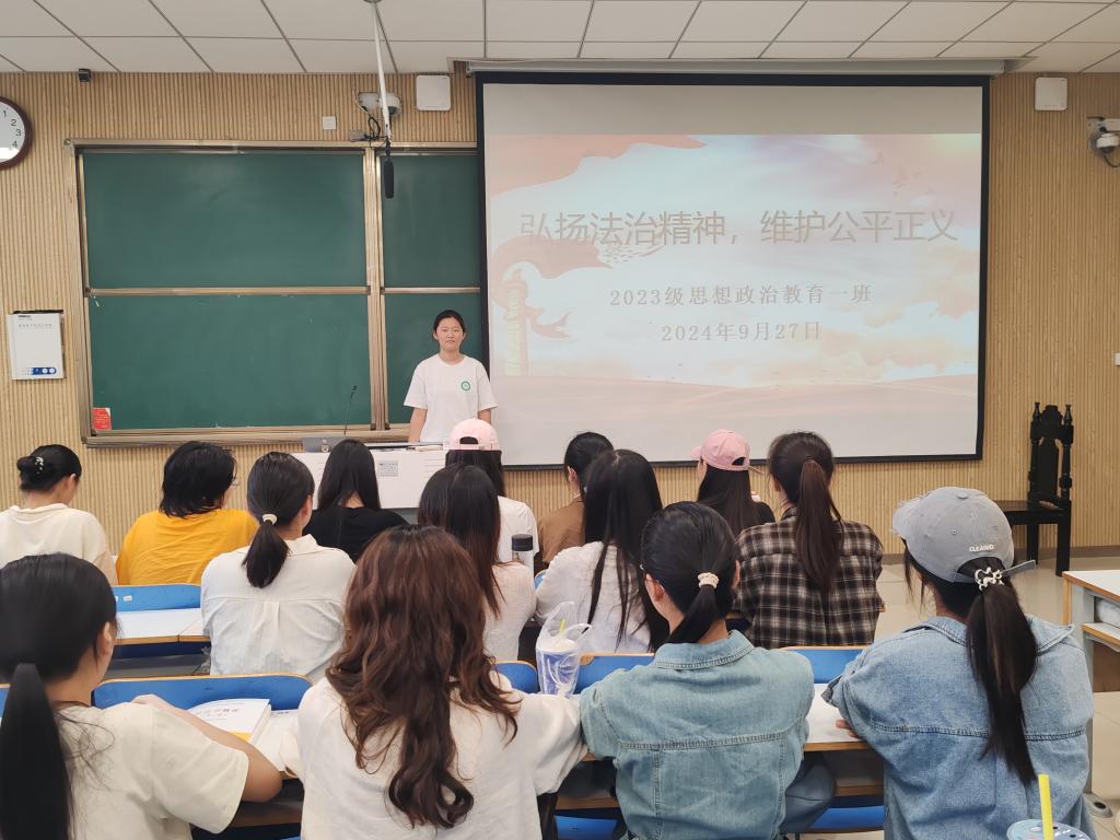 为弘扬宪法精神,增强法制意识,9月27日上午,beat365在线唯一官网2023级思想政治教育一班在社科楼515教室召开“弘扬法治精神,维护公平正义”主题团课。2023级思想政治教育一班全体同学参与本次团课,团课由团支书张卓主持。