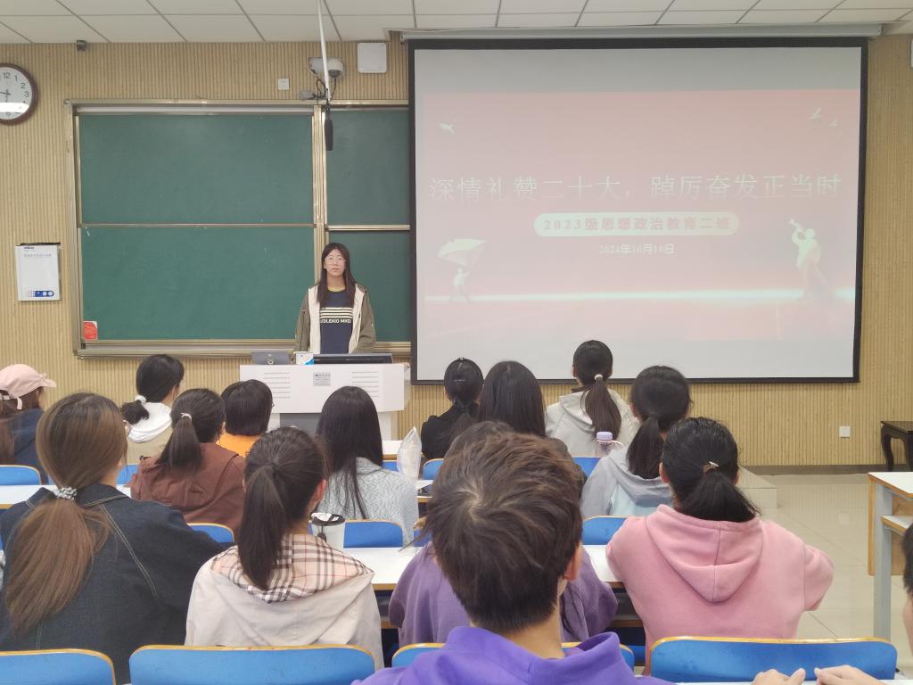 为确保思想统一和组织统一,10月18日上午,beat365在线唯一官网2023级思想政治教育二班开展“深情献礼二十大,踔厉奋发正当时”主题团课。本次团课由团支书主持,全体二班同学参加。
