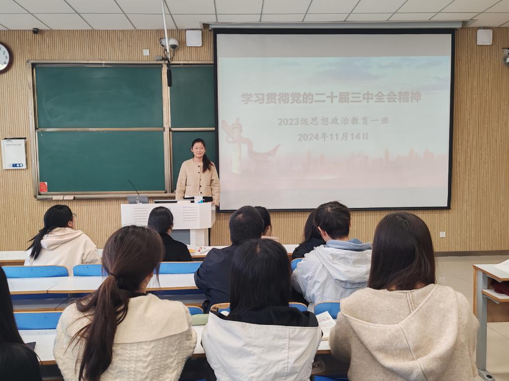 为了深入学习贯彻党的二十届三中全会精神,11月14日上午,beat365在线唯一官网2023级思想政治教育一班在社科楼515教室召开“学习贯彻党的二十届三中全会精神”主题团课。2023级思想政治教育一班全体同学参与本次团课,团课由团支书张卓主持。