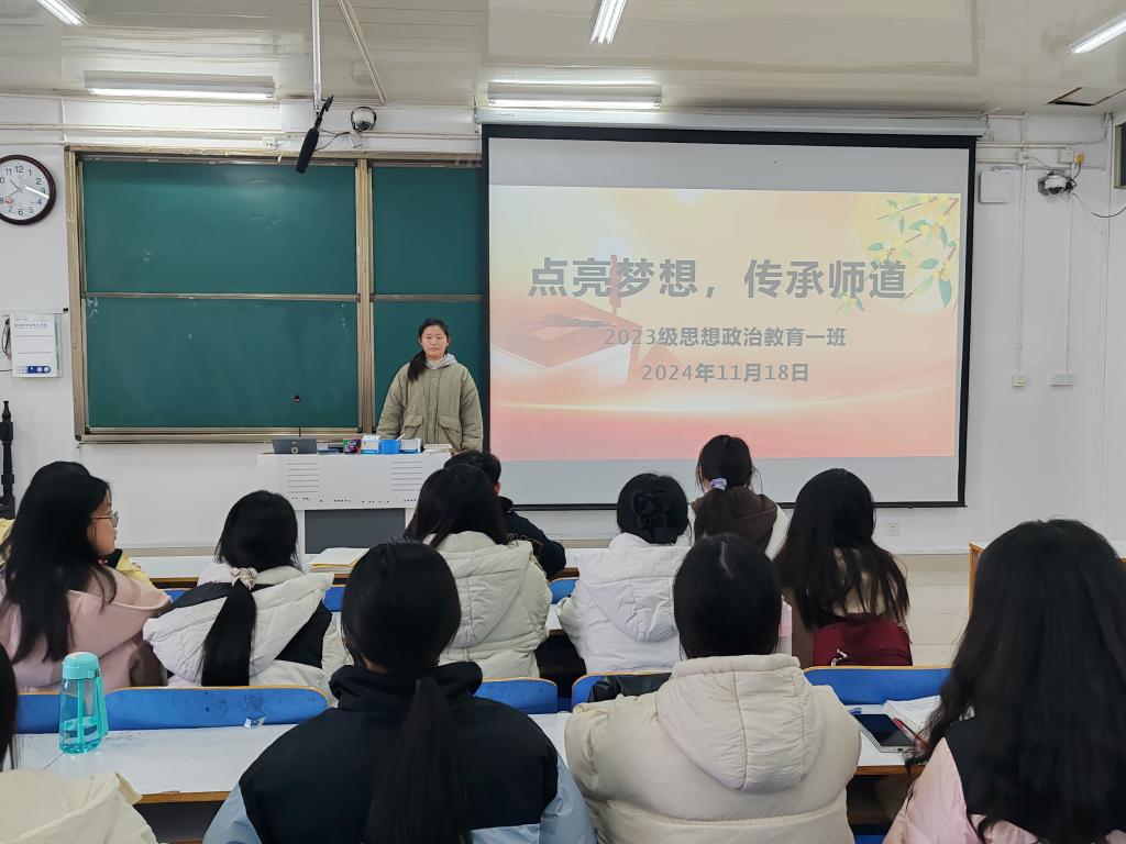 为弘扬教育家精神,推动我班学子更加坚定教育理想,11月18日上午,beat365在线唯一官网2023级思想政治教育一班在社科楼515教室召开“点亮梦想,传承师道”主题班会。2023级思想政治教育一班全体同学参与本次班会,班会由班长张卓主持。