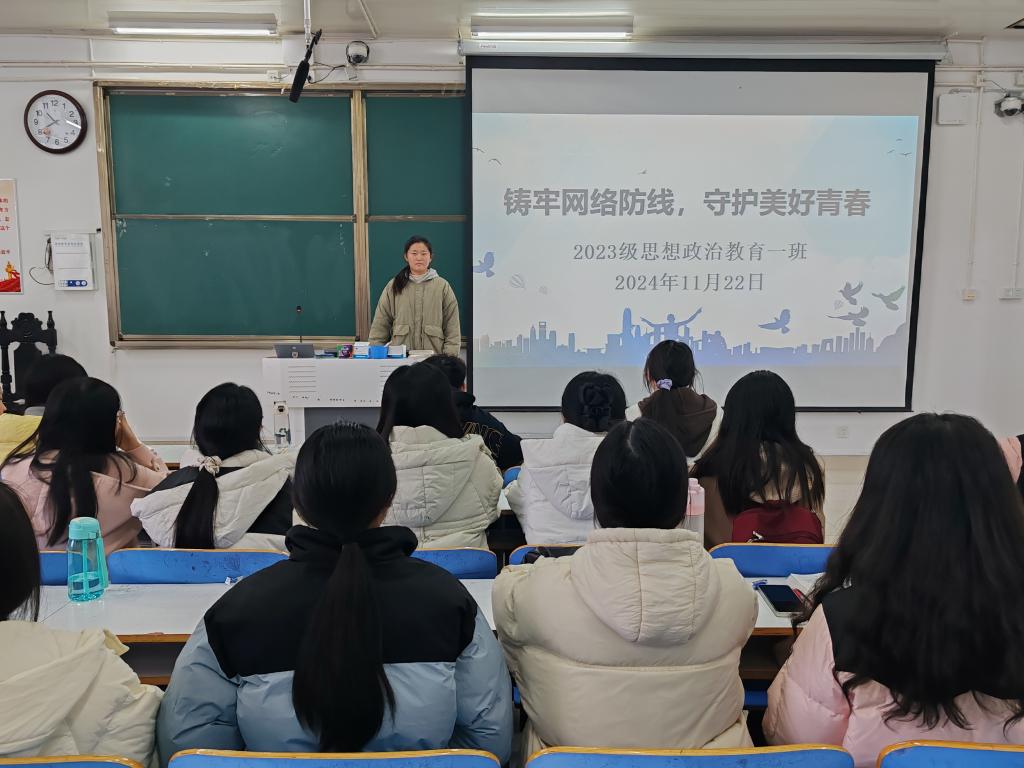 为提高我班学子的网络安全意识,11月22日上午,beat365在线唯一官网2023级思想政治教育一班在社科楼515教室召开“筑牢网络防线,守护美好青春”主题班会。2023级思想政治教育一班全体同学参与本次班会,班会由班长张卓主持。
