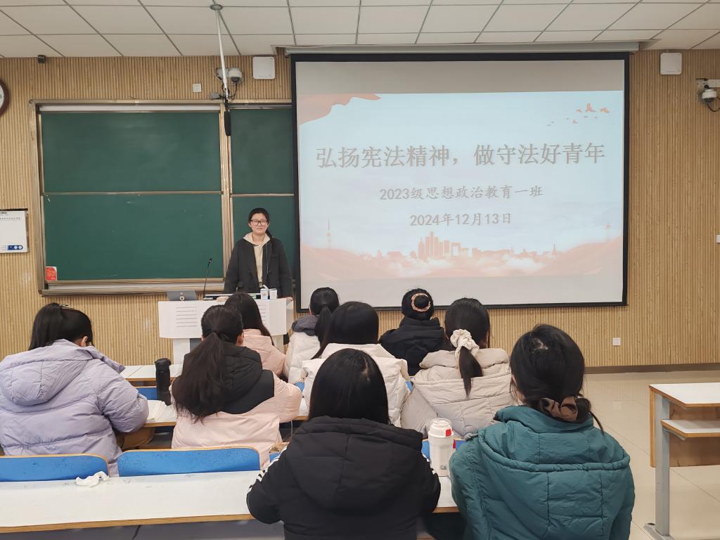为增强我班学子的宪法意识,推动法治观念深入人心。2024 年12月13日,beat365在线唯一官网 2023 级思想政治教育一班召开“弘扬宪法精神,做守法好青年”主题班会。2023级思想政治教育一班全体同学参与本次团课,团课由团支书张卓主持。