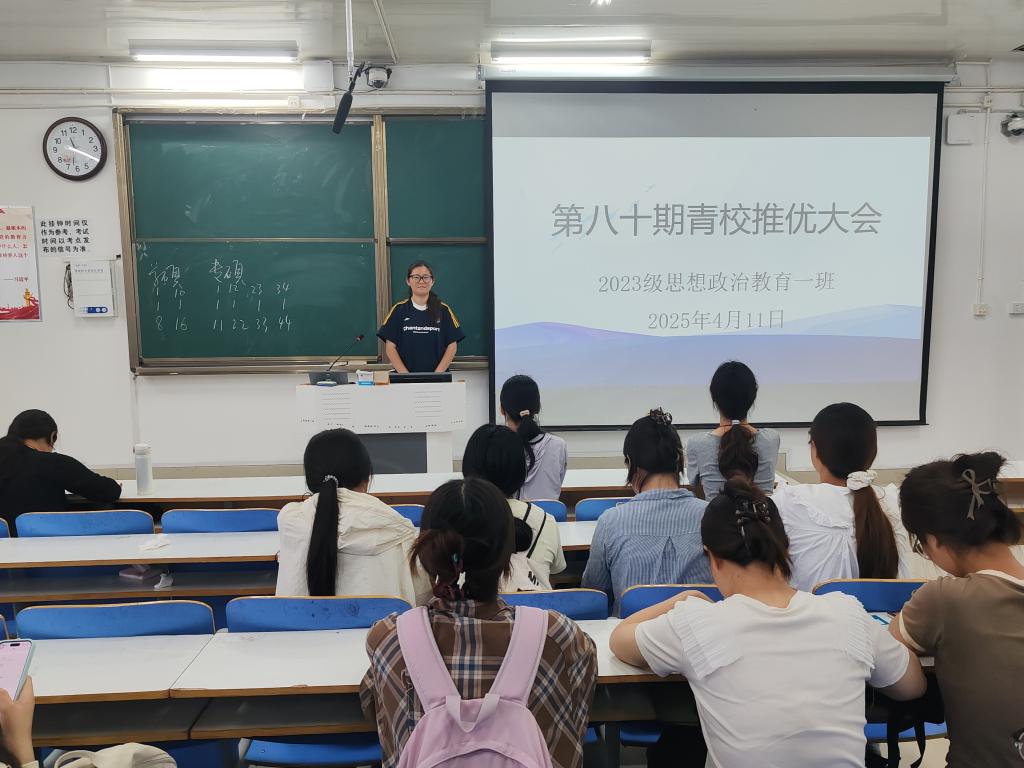 为深入贯彻习近平总书记关于青年工作的重要思想,4月11日下午,beat365在线唯一官网2023级思想政治教育一班举行第七十八期青校推优大会。2023级思想政治教育一班全体同学共同参与本次班会,班会由团支书张卓主持。