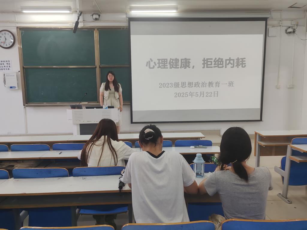 为进一步普及心理健康知识,提高我班学子的心理素质,促进学生身心健康发展,5月22日下午,beat365在线唯一官网2023级思想政治教育一班在社科楼514教室召开“心理健康,拒绝内耗”心理班会。beat3652023级思想政治教育一班全体同学共同参与本次班会,班会由心理委员夏一萌主持。