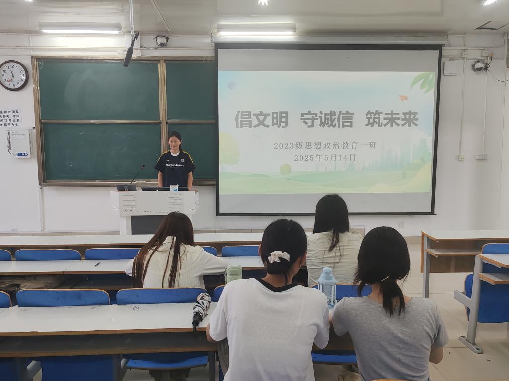 为培育文明风尚,强化诚信意识,引导青年学子规划美好未来,5月14日下午,beat365在线唯一官网2023级思想政治教育一班在社科楼514教室召开“倡文明,守诚信,筑未来”主题班会。beat3652023级思想政治教育一班全体同学共同参与本次班会,班会由班长张卓主持。