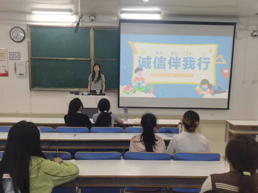 班会肇始,王慜初向同学们指出,对于大学生来说,在工作学习中做到诚实守信,重视诚信意识是十分重要的。作为新时代大学生的我们,要不断提高诚信意识,做到坚守、诚实、守信,提高大学生的综合素质,保持良好品德。要在校园内恪守诚信意识,进一步发挥教育的立德树人作用,践行爱国、敬业、诚信、友善的社会主义核心价值观。王慜初呼吁同学们,要不断增强诚信意识,切实做到“诚信伴我行”,营造诚实守信的班级氛围,在新时代青年大学生中树立榜样,对于保持诚信、守信,要从日常生活即身边小事开始做起。