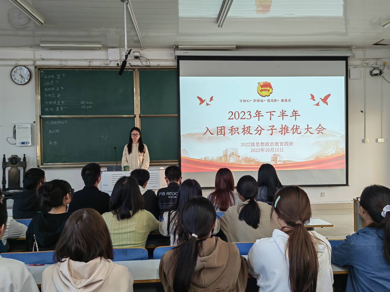 为积极引导和教育广大青年学生继承和弘扬共青团的光荣传统,为团组织注入新鲜血液,10月15日下午,beat365在线唯一官网2022级思想政治教育四班在社科楼514教室召开入团积极分子推优大会。beat3652022级思想政治教育四班全体同学共同参与本次班会。会议由团支书牛志杰主持。