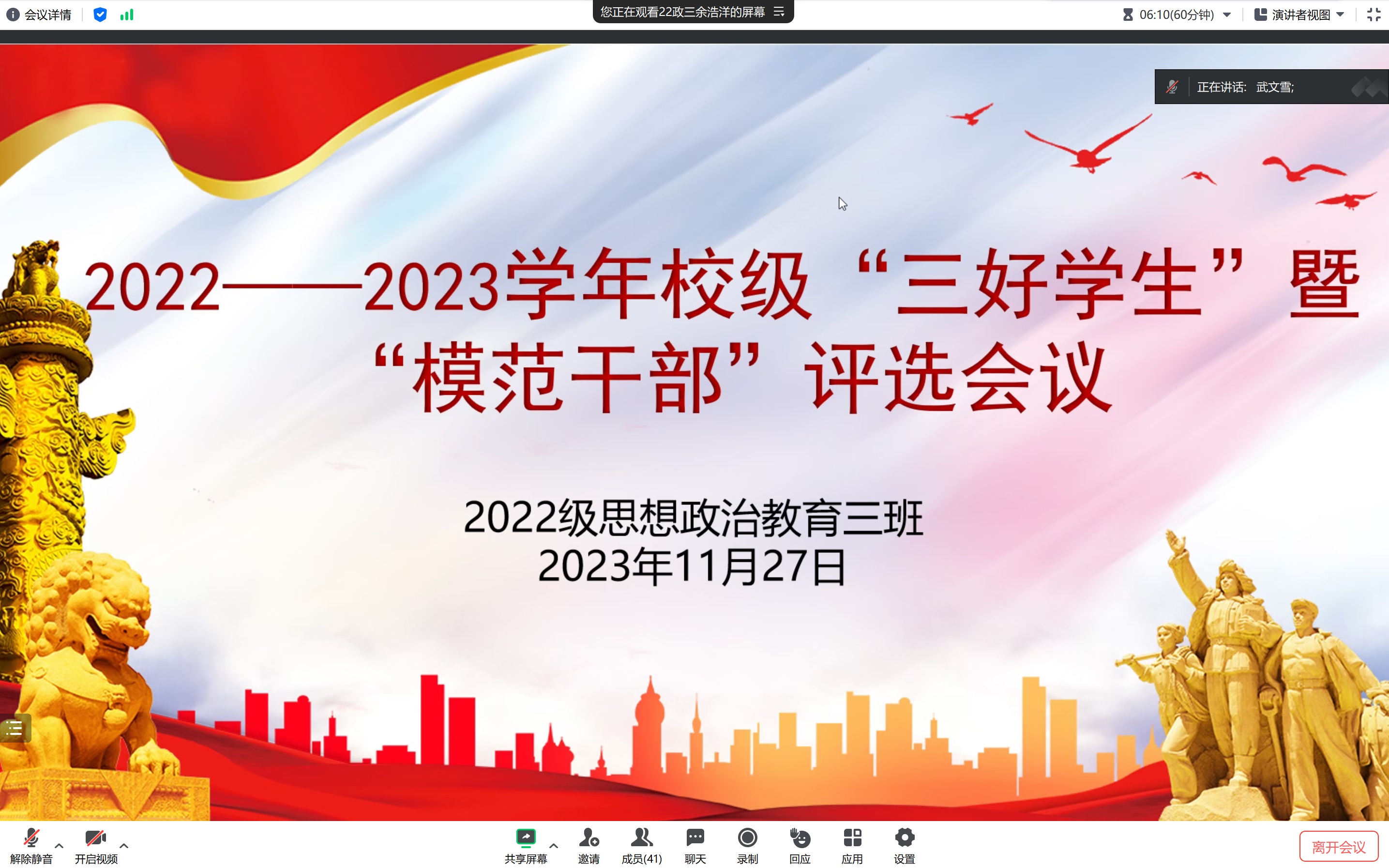11月27日晚,beat365在线唯一官网2022级思想政治教育三班在线上开展“三好学生”暨“模范干部”推优大会。beat3652022级思想政治教育三班全体成员共同参与此次推优大会。大会由班长余浩洋主持。
