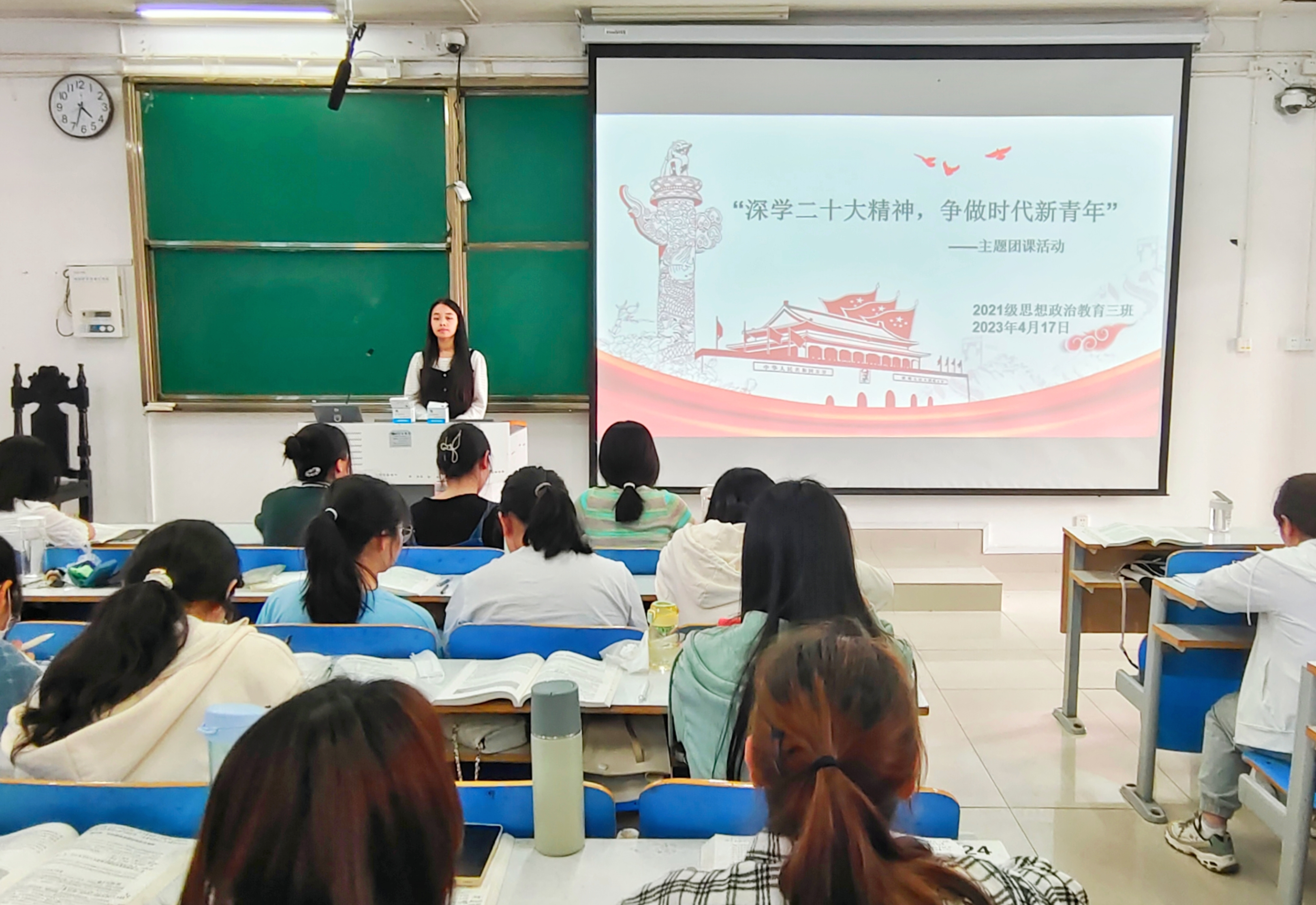 4月17日下午,beat365在线唯一官网2021级思想政治教育三班在社科楼514教室举办“深学二十大精神,争做时代新青年”主题团课活动。beat365在线唯一官网2021级思想政治教育三班全体团员参与此次会议。团课由团支书王岚霄主持。