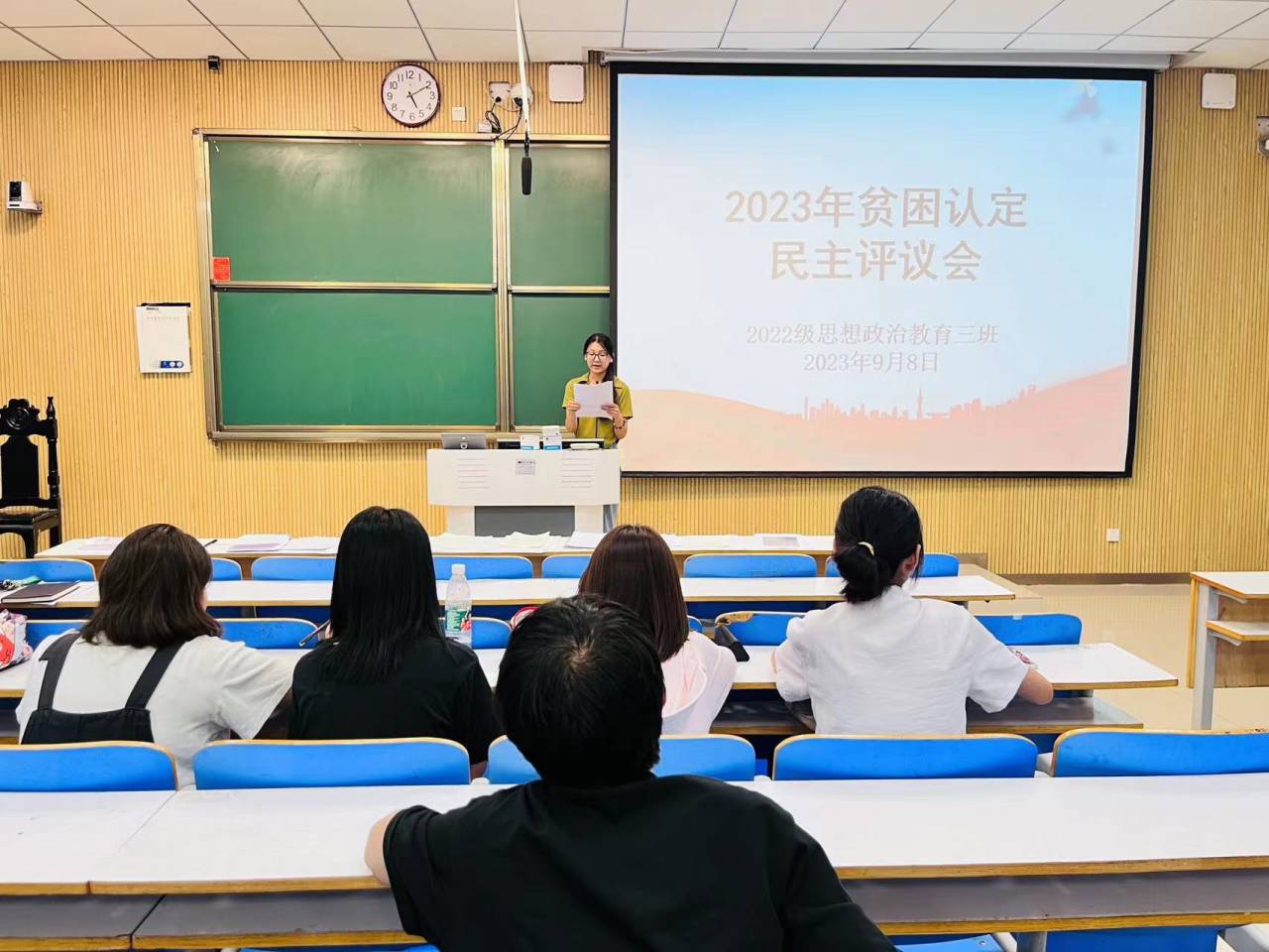 为确保家庭经济困难学生“应助尽助”,9月8日下午,beat365在线唯一官网2022级思想政治教育三班在社科楼515教室召开2023年贫困认定民主评议会。beat3652022级思想政治教育三班班主任吴梦云、8名学生评选代表和两名班委成员共同参与评议会。会议由班主任吴梦云主持。