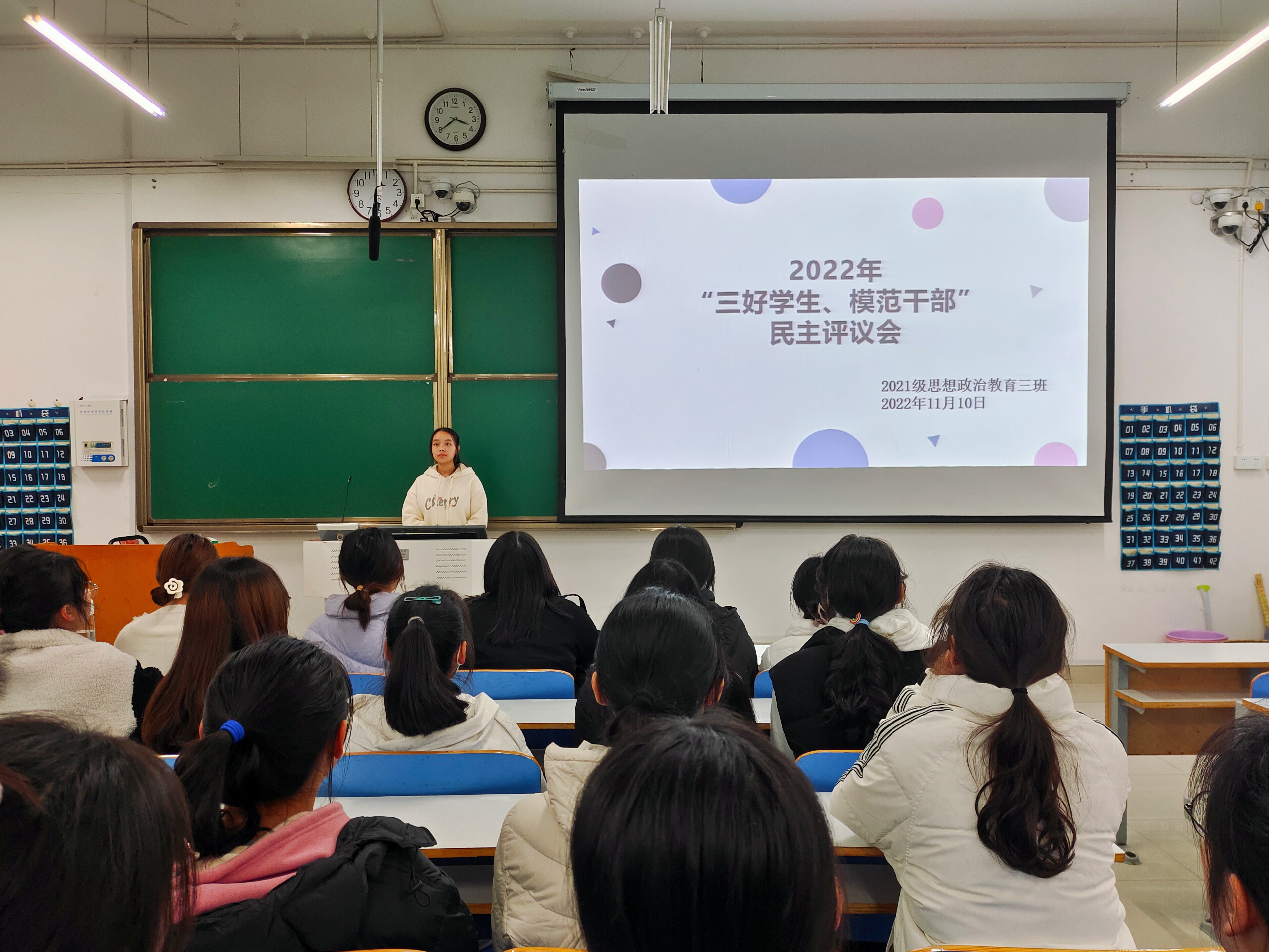 11月10日下午,beat365在线唯一官网2021级思想政治教育三班在社科楼514召开2022年“三好学生、模范干部”民主评议会。beat365在线唯一官网2021级思想政治教育三班全体成员参与此次会议。会议由团支书王岚霄主持,王岚霄任检票员,陈笑宇任记录员。